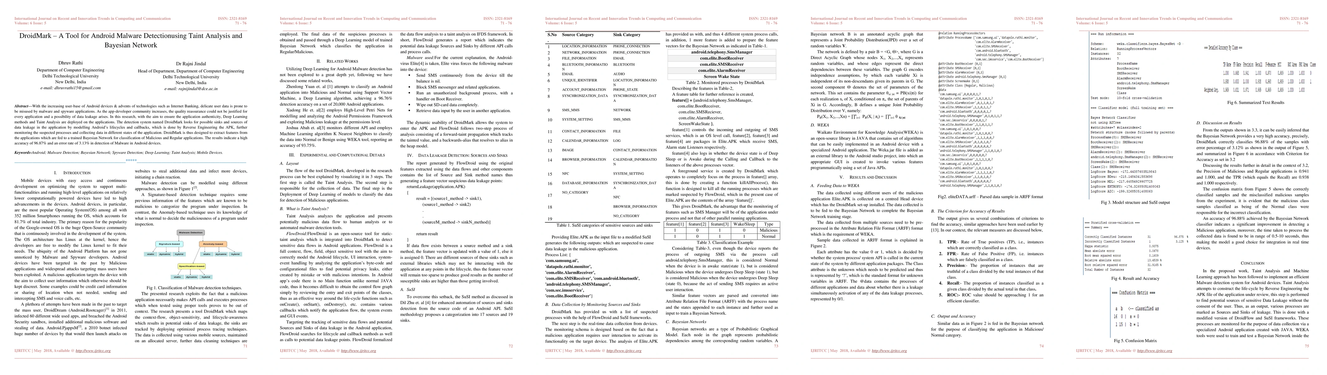 With the increasing user base of Android devices and advent of technologies such as Internet Banking, delicate user data is prone to be misused by malware and spyware applications. As the app developer community increases, the quality reassurance could not be justified for every application and a possibility of data leakage arises. In this research, with the aim to ensure the application authenticity, Deep Learning methods and Taint Analysis are deployed on the applications. The detection system named DroidMark looks for possible sinks and sources of data leakage in the application by modelling Android lifecycle and callbacks, which is done by Reverse Engineering the APK, further monitoring the suspected processes and collecting data in different states of the application. DroidMark is thus designed to extract features from the applications which are fed to a trained Bayesian Network for classification of Malicious and Regular applications. The results indicate a high accuracy of 96.87% and an error rate of 3.13% in the detection of Malware in Android devices.