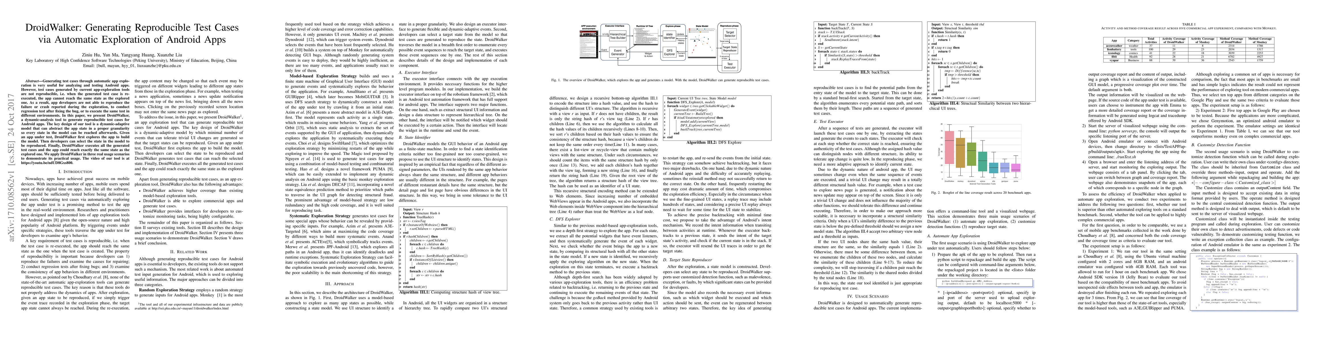 DroidWalker is a dynamic-analysis tool designed to generate reproducible test cases for Android apps by automatically exploring the app and building a dynamic-adaptive model. This tool allows developers to reproduce app states and execute test cases reliably, facilitating bug reproduction, regression testing, and cross-environment testing.