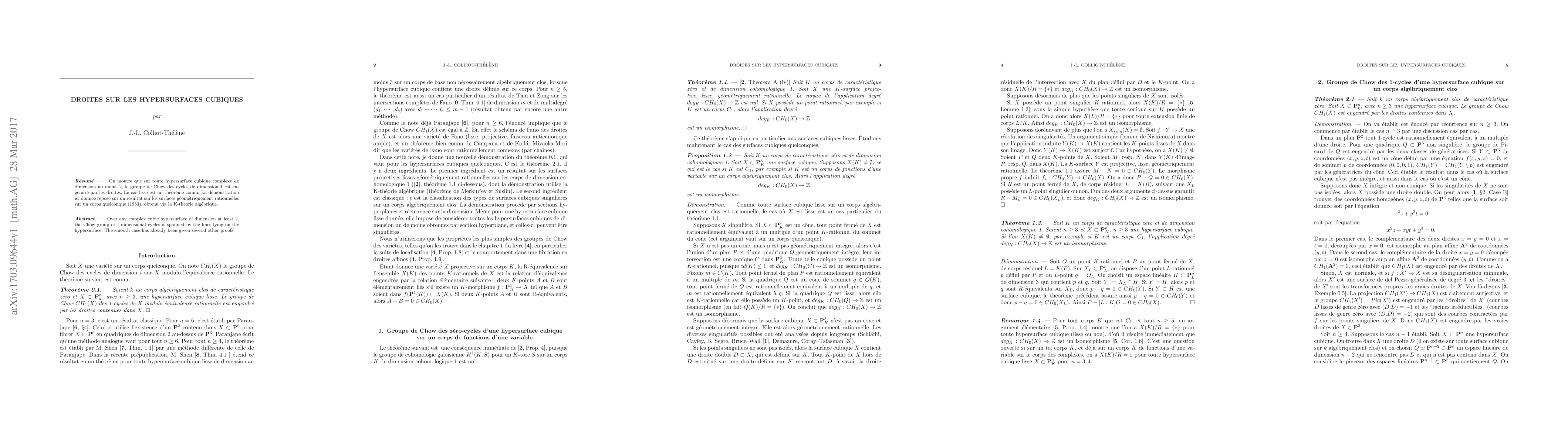 Over any complex cubic hypersurface of dimension at least 2, the Chow group of 1-dimensional cycles is spanned by the lines lying on the hypersurface. The smooth case has already been given several other proofs. -- On montre que sur toute hypersurface cubique complexe de dimension au moins 2, le groupe de Chow des cycles de dimension 1 est engendr\'e par les droites. Le cas lisse est un th\'eor\`eme connu. La d\'emonstration ici donn\'ee repose sur un r\'esultat sur les surfaces g\'eom\'etriquement rationnelles sur un corps quelconque (1983), obtenu via la K-th\'eorie alg\'ebrique.
