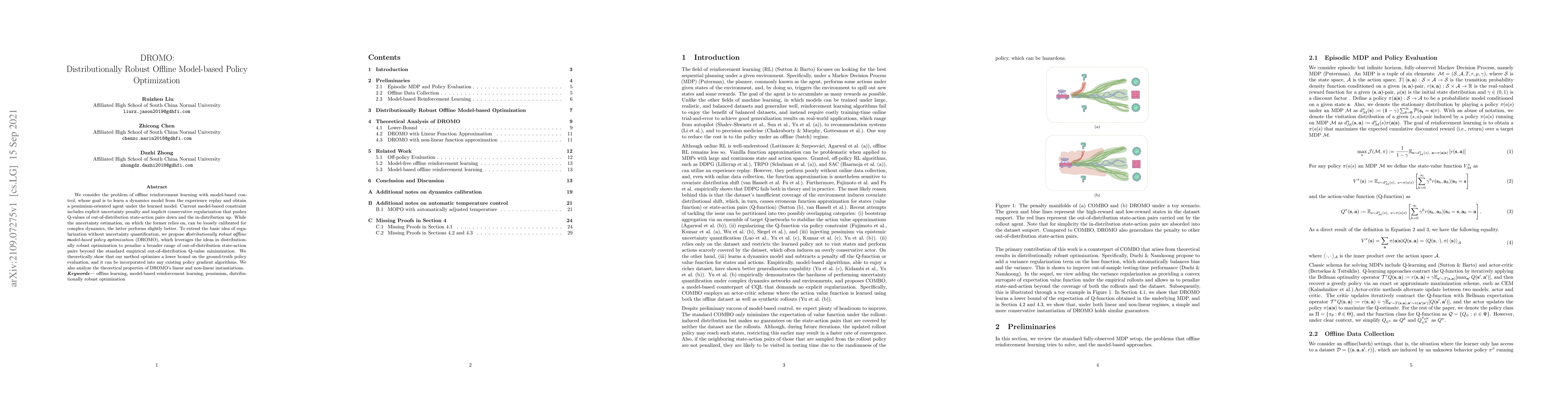 The paper proposes DROMO, a distributionally robust offline model-based policy optimization method, to improve offline reinforcement learning by penalizing a broader range of out-of-distribution state-action pairs. DROMO optimizes a lower bound on the ground-truth policy evaluation and can be integrated with existing policy gradient algorithms.