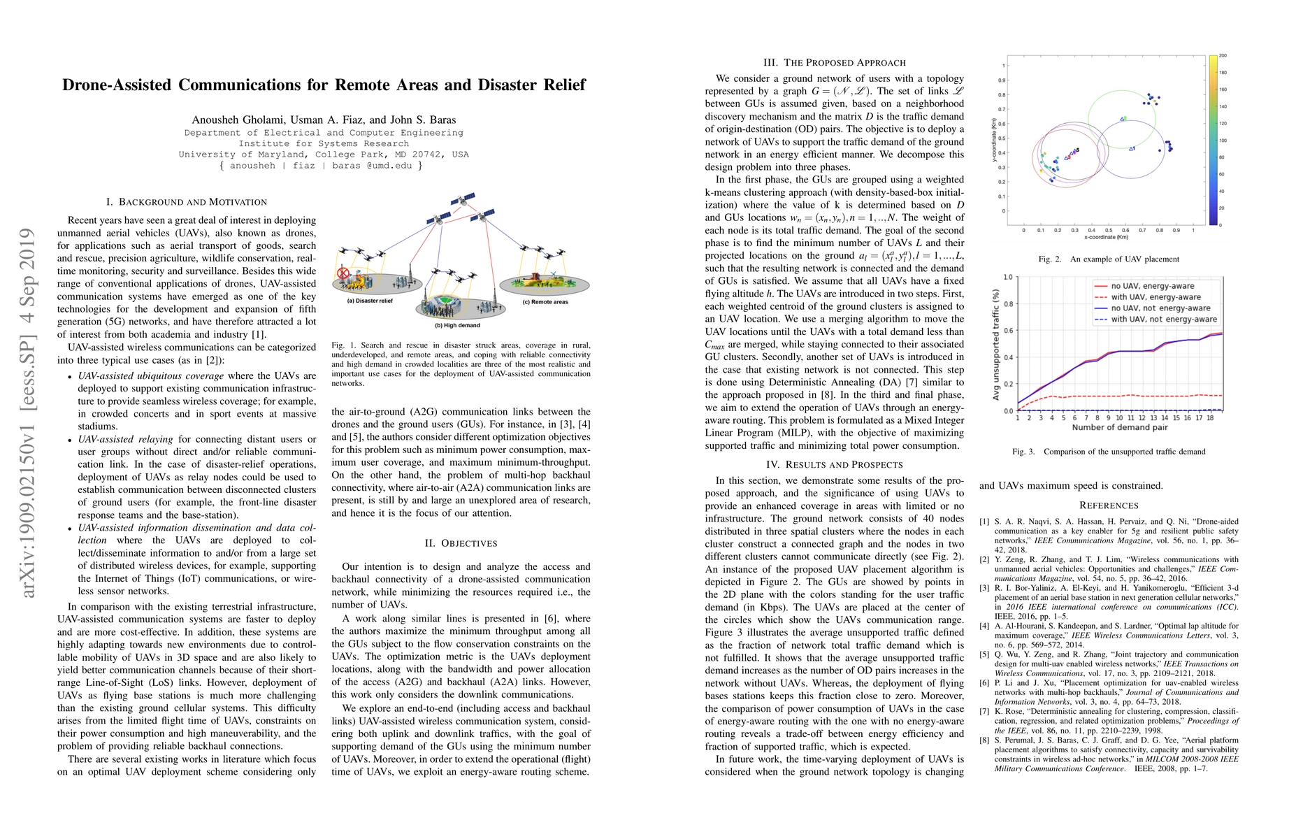 This paper investigates a UAV-assisted wireless communication system for remote and disaster-stricken areas, optimizing both uplink and downlink communication to meet Ground Users' demands with minimal UAVs. An energy-aware routing scheme is employed to extend UAV operational time, aiming to enhance connectivity while minimizing resource use.