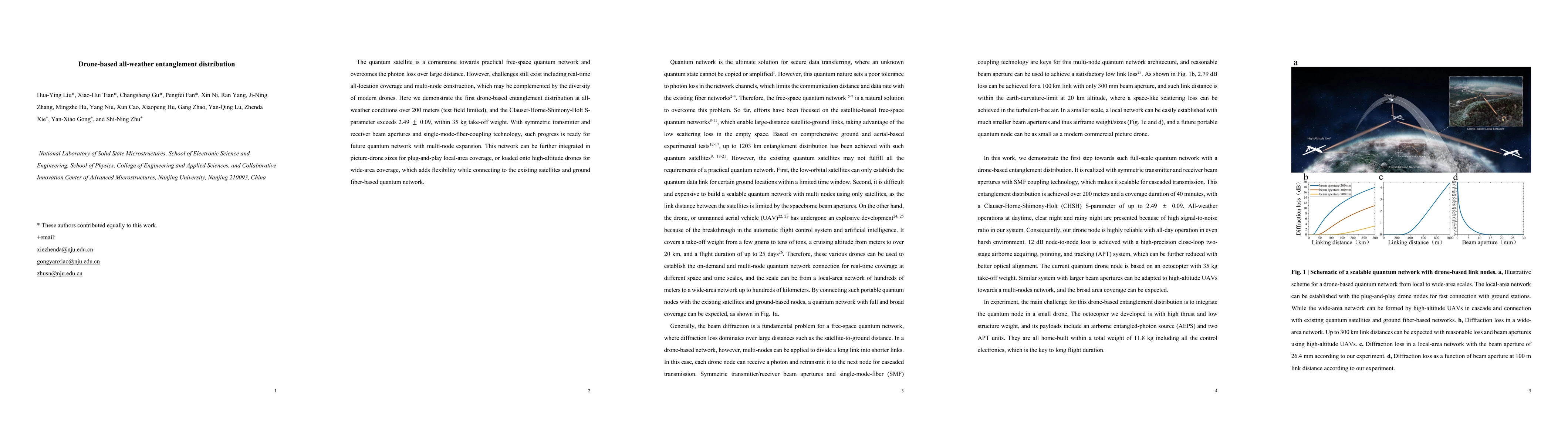 This paper demonstrates the first all-weather drone-based quantum entanglement distribution over 200 meters, achieving a high S-parameter exceeding 2.49, and weighs under 35 kg. The method uses symmetric beam apertures and single-mode fiber coupling, paving the way for scalable multi-node quantum networks.