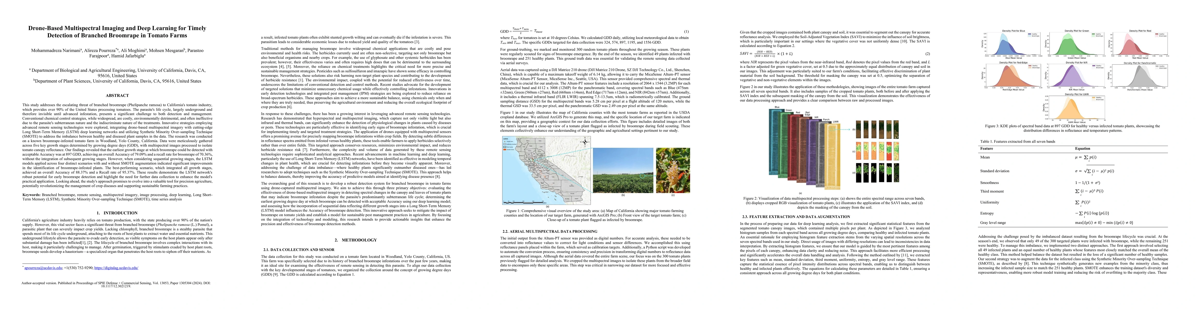 This study addresses the escalating threat of branched broomrape (Phelipanche ramosa) to California's tomato industry, which supplies over 90 percent of U.S. processing tomatoes. The parasite's largely underground life cycle makes early detection difficult, while conventional chemical controls are costly, environmentally harmful, and often ineffective. To address this, we combined drone-based multispectral imagery with Long Short-Term Memory (LSTM) deep learning networks, using the Synthetic Minority Over-sampling Technique (SMOTE) to handle class imbalance. Research was conducted on a known broomrape-infested tomato farm in Woodland, Yolo County, CA, across five key growth stages determined by growing degree days (GDD). Multispectral images were processed to isolate tomato canopy reflectance. At 897 GDD, broomrape could be detected with 79.09 percent overall accuracy and 70.36 percent recall without integrating later stages. Incorporating sequential growth stages with LSTM improved detection substantially. The best-performing scenario, which integrated all growth stages with SMOTE augmentation, achieved 88.37 percent overall accuracy and 95.37 percent recall. These results demonstrate the strong potential of temporal multispectral analysis and LSTM networks for early broomrape detection. While further real-world data collection is needed for practical deployment, this study shows that UAV-based multispectral sensing coupled with deep learning could provide a powerful precision agriculture tool to reduce losses and improve sustainability in tomato production.