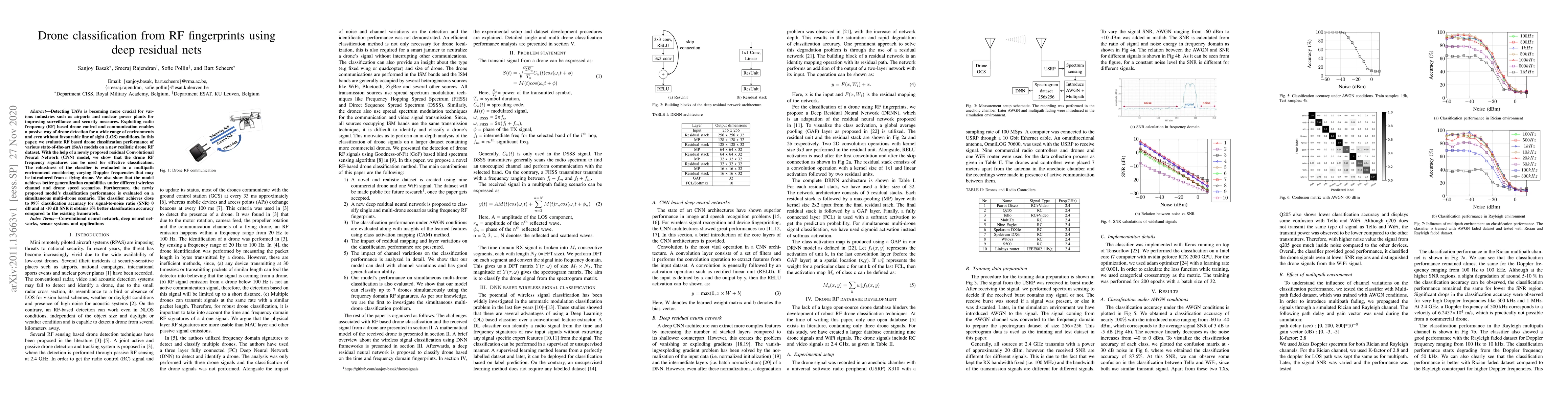 This paper proposes a residual Convolutional Neural Network (CNN) model for classifying drones based on their RF fingerprints, demonstrating improved accuracy and robustness in various wireless channel and drone speed scenarios. The model achieves nearly 99% accuracy at 0 dB SNR and shows significant performance gains over existing frameworks.