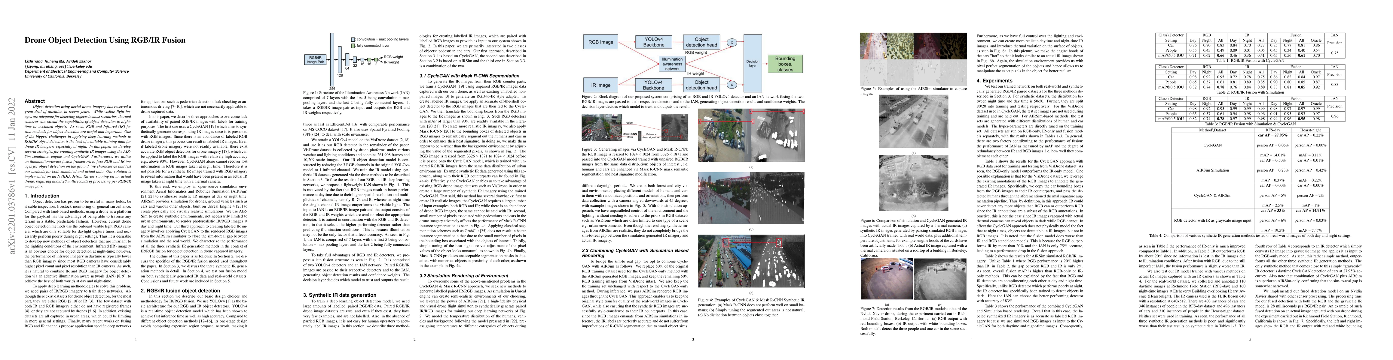 This paper develops strategies to create synthetic IR images using AIRSim and CycleGAN to address the lack of training data for drone IR imagery at night. It employs an illumination-aware fusion framework to combine RGB and IR images for object detection, tested on both simulated and real data, with processing taking about 28 milliseconds per pair on an NVIDIA Jetson Xavier drone.