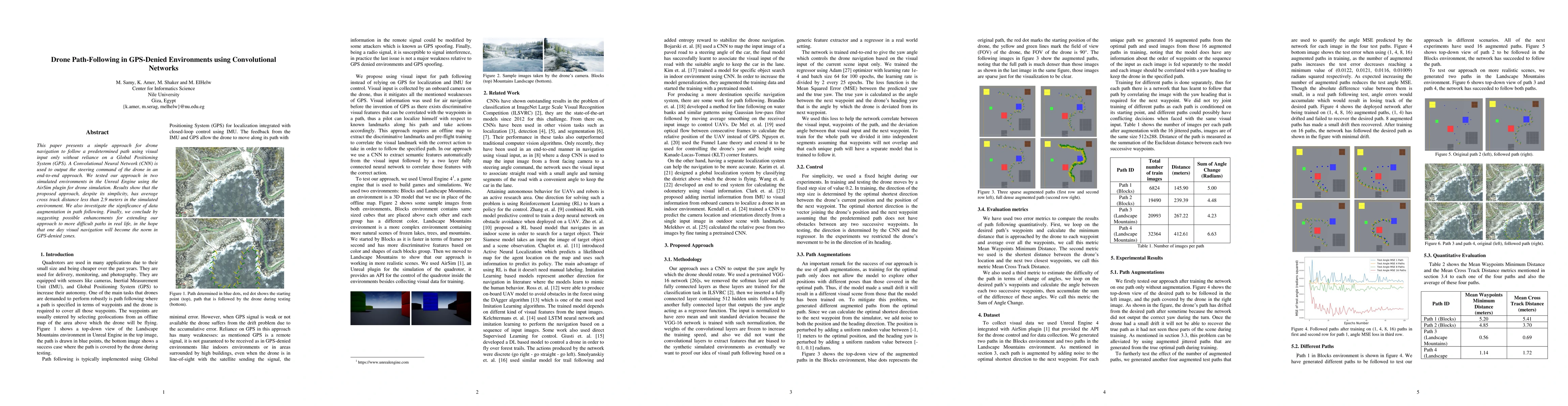 This paper proposes a CNN-based method for drone navigation in GPS-denied environments, relying solely on visual input to follow a predetermined path. The approach was tested in simulated environments, achieving a cross track distance of less than 2.9 meters, highlighting the potential of visual navigation in challenging conditions.