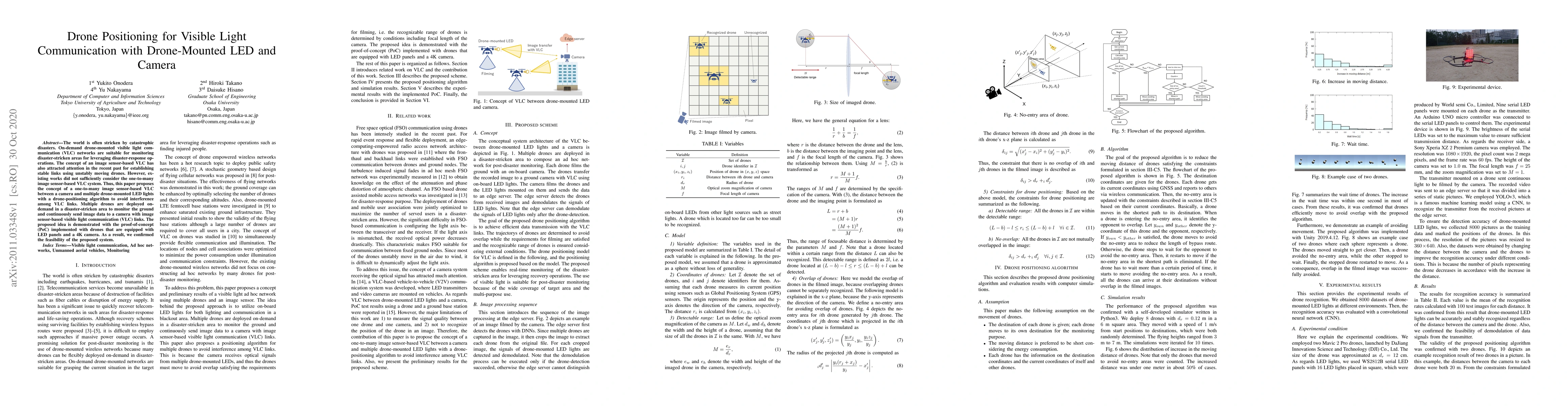 This paper proposes a one-to-many visible light communication (VLC) system using drones equipped with LED lights and a camera to monitor disaster-stricken areas. A drone-positioning algorithm is introduced to manage interference among VLC links, ensuring stable communication.