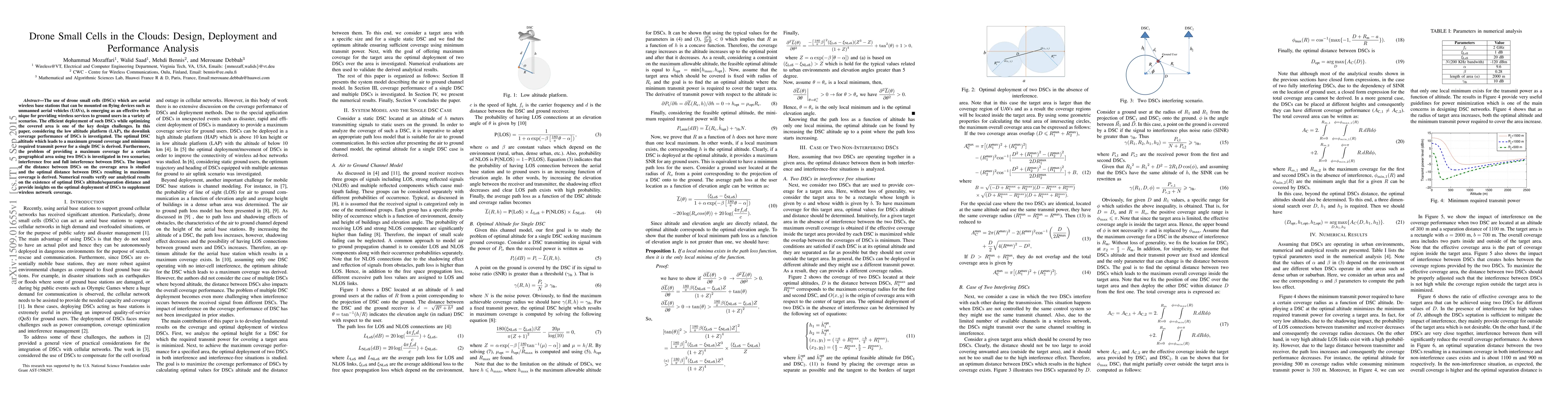 This paper investigates the deployment and performance of drone small cells (DSCs) for optimizing wireless coverage. It derives the optimal altitude and separation distance for DSCs to maximize ground coverage and minimize transmit power, considering both interference-free and full interference scenarios. Numerical results confirm the analytical findings on optimal DSC placement.