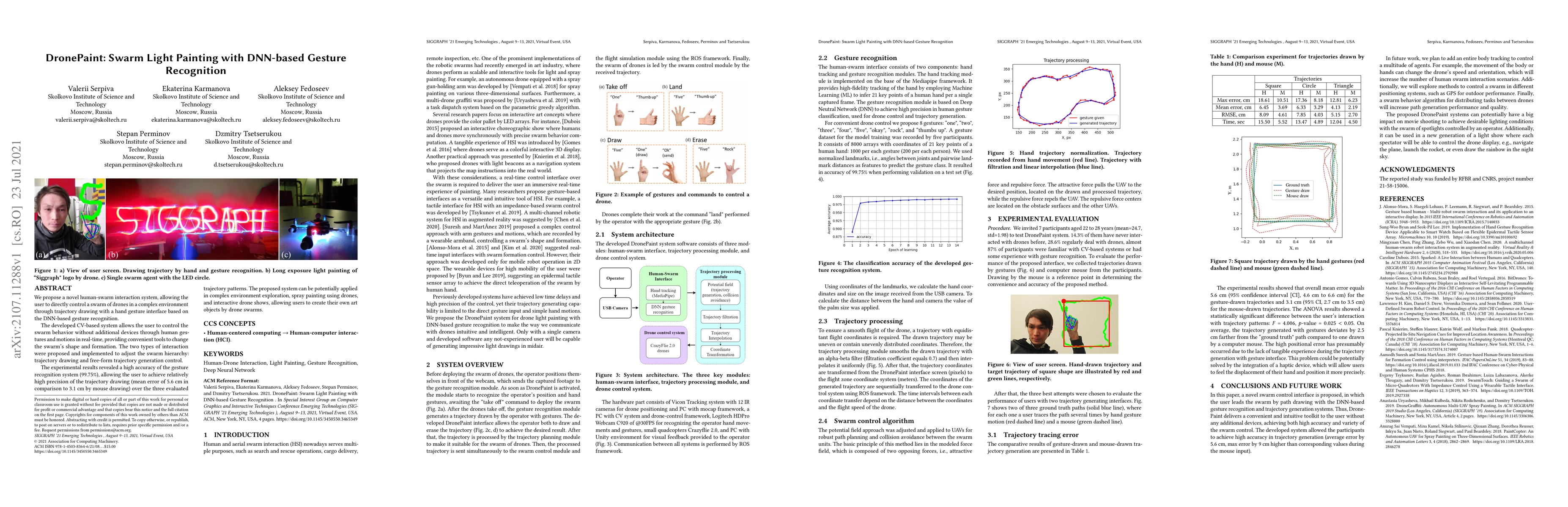 DronePaint introduces a DNN-based gesture recognition system enabling users to control a drone swarm through hand gestures, achieving high accuracy (99.75%) and precision in trajectory drawing for applications like environment exploration, painting, and interactive drone shows.