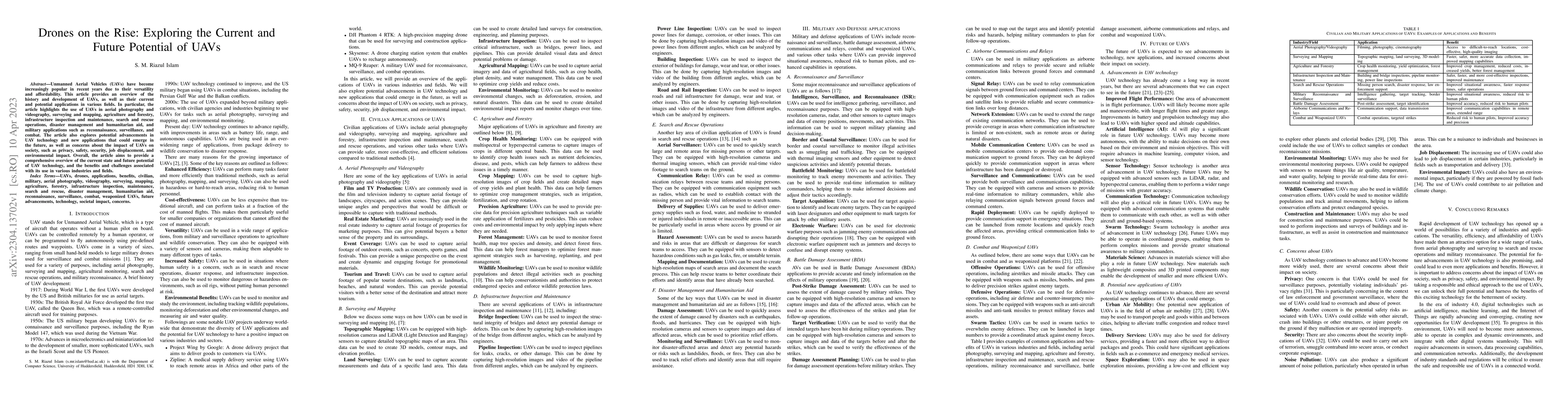 Unmanned Aerial Vehicles (UAVs) have become increasingly popular in recent years due to their versatility and affordability. This article provides an overview of the history and development of UAVs, as well as their current and potential applications in various fields. In particular, the article highlights the use of UAVs in aerial photography and videography, surveying and mapping, agriculture and forestry, infrastructure inspection and maintenance, search and rescue operations, disaster management and humanitarian aid, and military applications such as reconnaissance, surveillance, and combat. The article also explores potential advancements in UAV technology and new applications that could emerge in the future, as well as concerns about the impact of UAVs on society, such as privacy, safety, security, job displacement, and environmental impact. Overall, the article aims to provide a comprehensive overview of the current state and future potential of UAV technology, and the benefits and challenges associated with its use in various industries and fields.