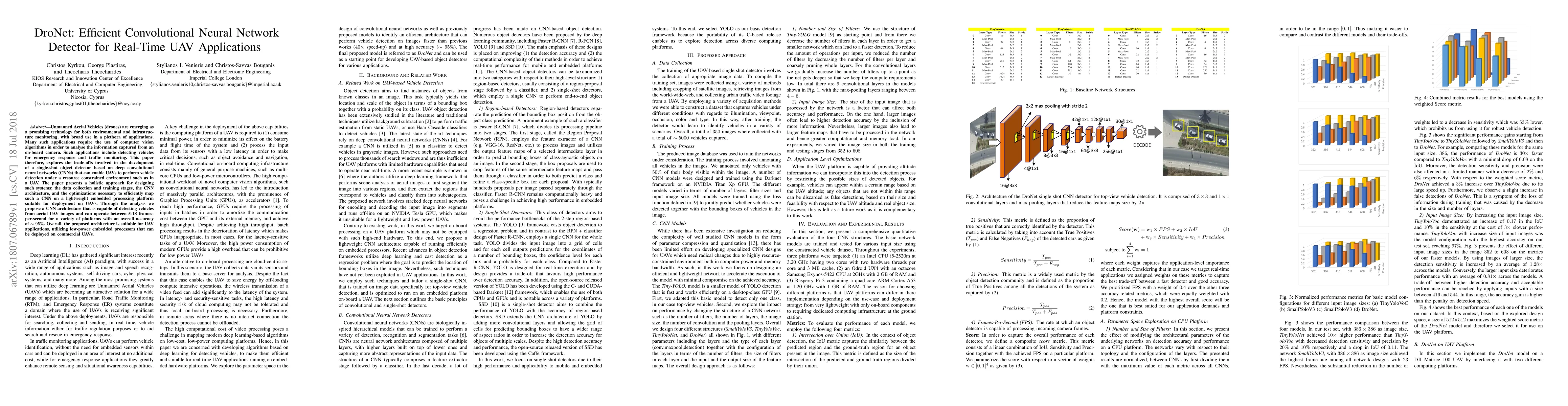 Unmanned Aerial Vehicles (drones) are emerging as a promising technology for both environmental and infrastructure monitoring, with broad use in a plethora of applications. Many such applications require the use of computer vision algorithms in order to analyse the information captured from an on-board camera. Such applications include detecting vehicles for emergency response and traffic monitoring. This paper therefore, explores the trade-offs involved in the development of a single-shot object detector based on deep convolutional neural networks (CNNs) that can enable UAVs to perform vehicle detection under a resource constrained environment such as in a UAV. The paper presents a holistic approach for designing such systems; the data collection and training stages, the CNN architecture, and the optimizations necessary to efficiently map such a CNN on a lightweight embedded processing platform suitable for deployment on UAVs. Through the analysis we propose a CNN architecture that is capable of detecting vehicles from aerial UAV images and can operate between 5-18 frames-per-second for a variety of platforms with an overall accuracy of ~95%. Overall, the proposed architecture is suitable for UAV applications, utilizing low-power embedded processors that can be deployed on commercial UAVs.