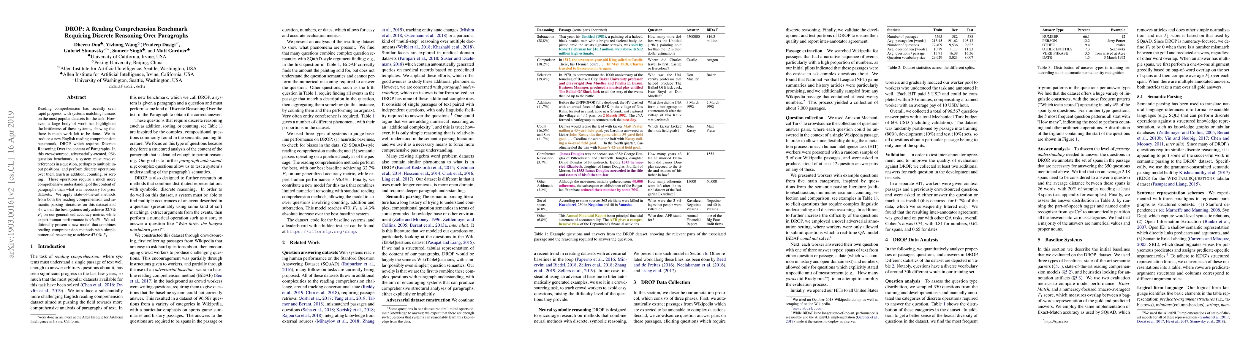 The DROP benchmark introduces a new reading comprehension test requiring discrete reasoning over paragraph content, highlighting the limitations of current systems. Despite state-of-the-art methods, the best performing system achieves only 32.7% F1, far below the 96.0% human performance, underscoring the need for more advanced comprehension models.