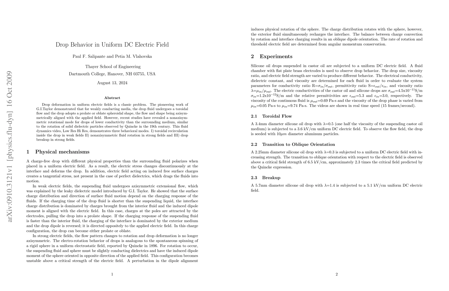 Drop deformation in uniform electric fields is a classic problem. The pioneering work of G.I.Taylor demonstrated that for weakly conducting media, the drop fluid undergoes a toroidal flow and the drop adopts a prolate or oblate spheroidal shape, the flow and shape being axisymmetrically aligned with the applied field. However, recent studies have revealed a nonaxisymmetric rotational mode for drops of lower conductivity than the surrounding medium, similar to the rotation of solid dielectric particles observed by Quincke in the 19th century. This fluid dynamics video demonstrates three behavioral modes. I) toroidal recirculation inside the drop in weak fields II) nonaxisymmetric fluid rotation in strong fields and III) drop breakup in strong fields.