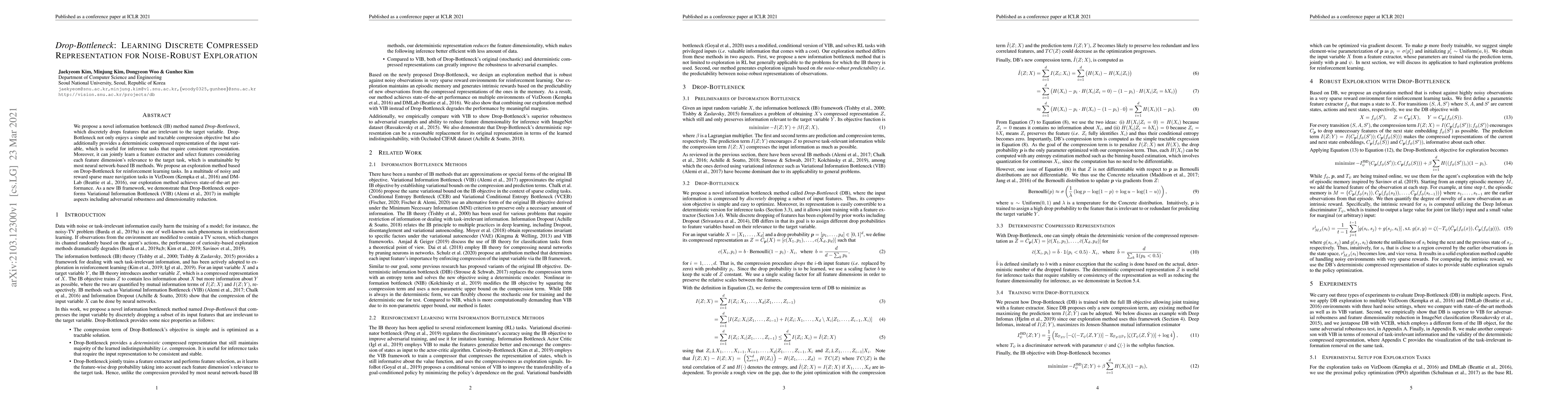 We propose a novel information bottleneck (IB) method named Drop-Bottleneck, which discretely drops features that are irrelevant to the target variable. Drop-Bottleneck not only enjoys a simple and tractable compression objective but also additionally provides a deterministic compressed representation of the input variable, which is useful for inference tasks that require consistent representation. Moreover, it can jointly learn a feature extractor and select features considering each feature dimension's relevance to the target task, which is unattainable by most neural network-based IB methods. We propose an exploration method based on Drop-Bottleneck for reinforcement learning tasks. In a multitude of noisy and reward sparse maze navigation tasks in VizDoom (Kempka et al., 2016) and DMLab (Beattie et al., 2016), our exploration method achieves state-of-the-art performance. As a new IB framework, we demonstrate that Drop-Bottleneck outperforms Variational Information Bottleneck (VIB) (Alemi et al., 2017) in multiple aspects including adversarial robustness and dimensionality reduction.