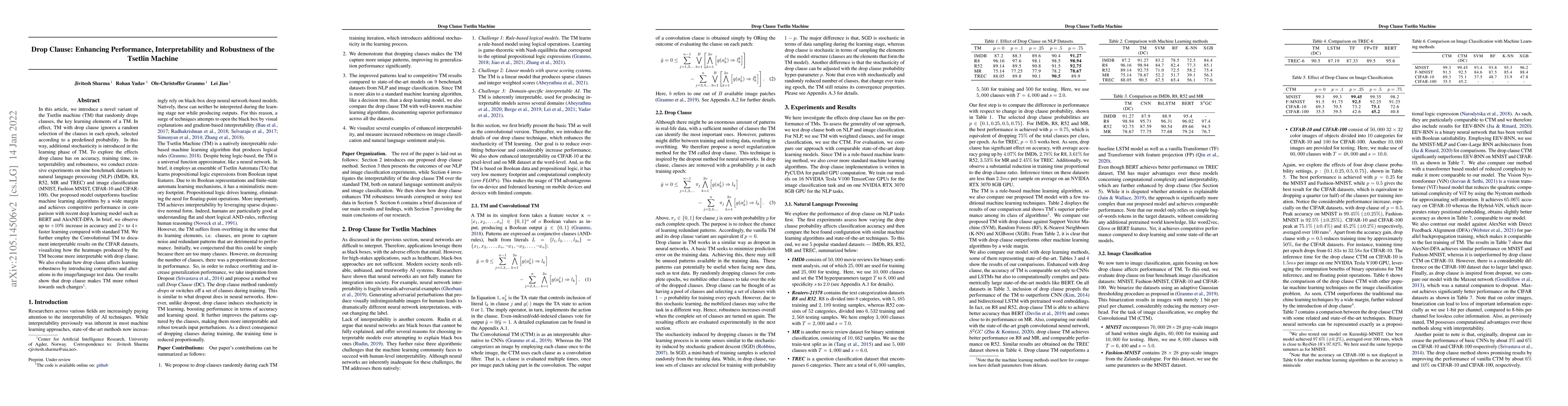 This paper introduces a modified Tsetlin machine with a drop clause that randomly ignores clauses during training, enhancing performance, interpretability, and robustness. Experiments on NLP and image datasets show up to a 10% accuracy boost and significantly faster learning compared to standard Tsetlin machines, while also improving interpretability and robustness against data corruptions.