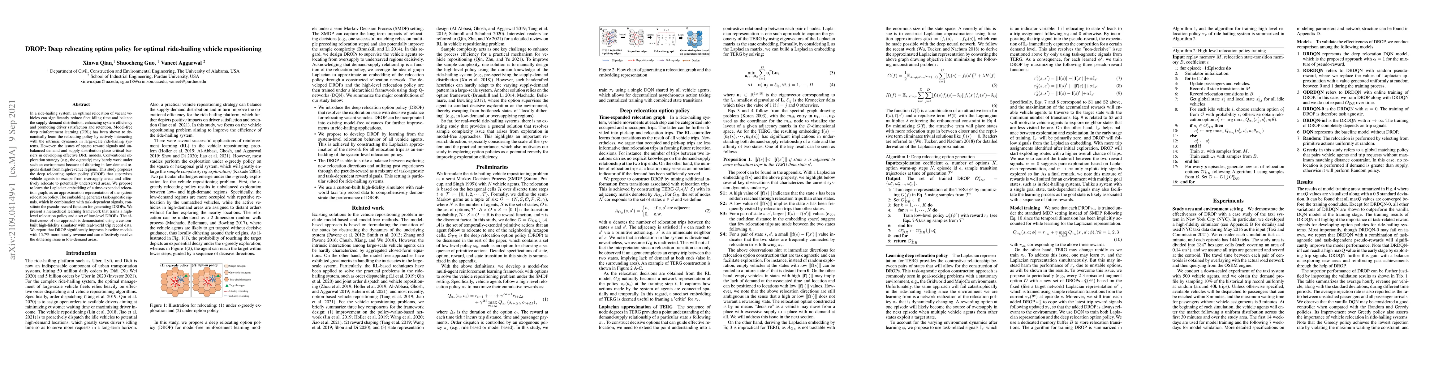 This paper proposes DROP, a deep relocating option policy using model-free deep reinforcement learning to optimize ride-hailing vehicle repositioning, addressing sparse rewards and demand-supply imbalances. DROP leverages Laplacian embedding of a relocation graph to generate pseudo-rewards, significantly improving revenue by 15.7% compared to baseline models.