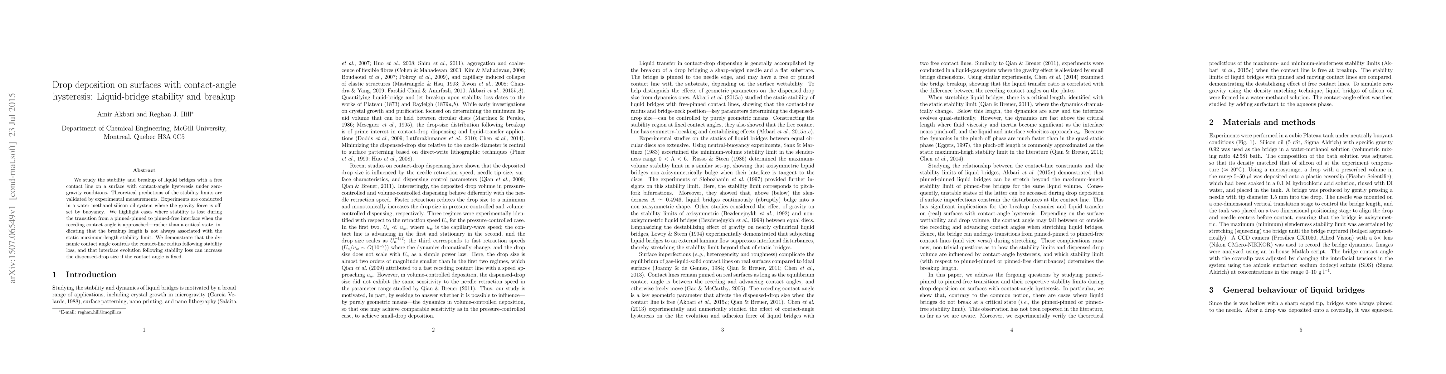 This study investigates the stability and breakup of liquid bridges on surfaces with contact-angle hysteresis under zero-gravity, revealing that stability loss occurs during the transition from a pinned-pinned to a pinned-free interface. The dynamic contact angle influences the contact-line radius post-stability loss, potentially increasing the dispensed drop size.