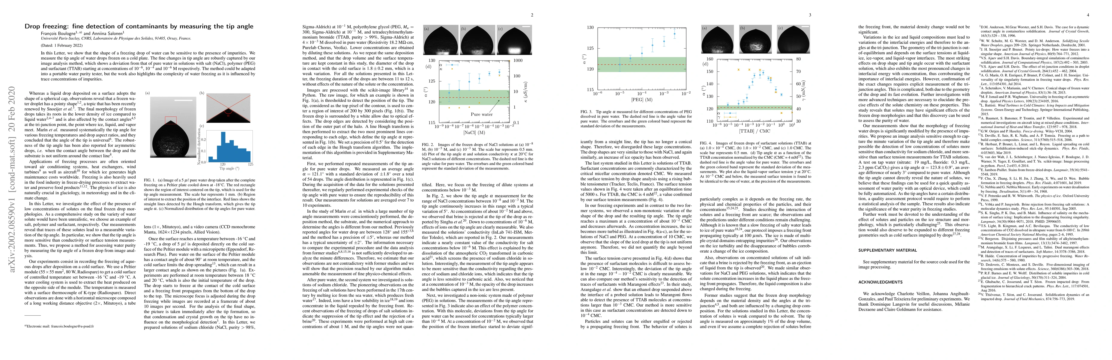 This research demonstrates that the tip angle of freezing water drops can detect trace contaminants, showing deviations in the presence of salt, polymer, and surfactant at very low concentrations. The method could potentially be developed into a portable water purity tester, highlighting the intricate effects of impurities on water freezing.