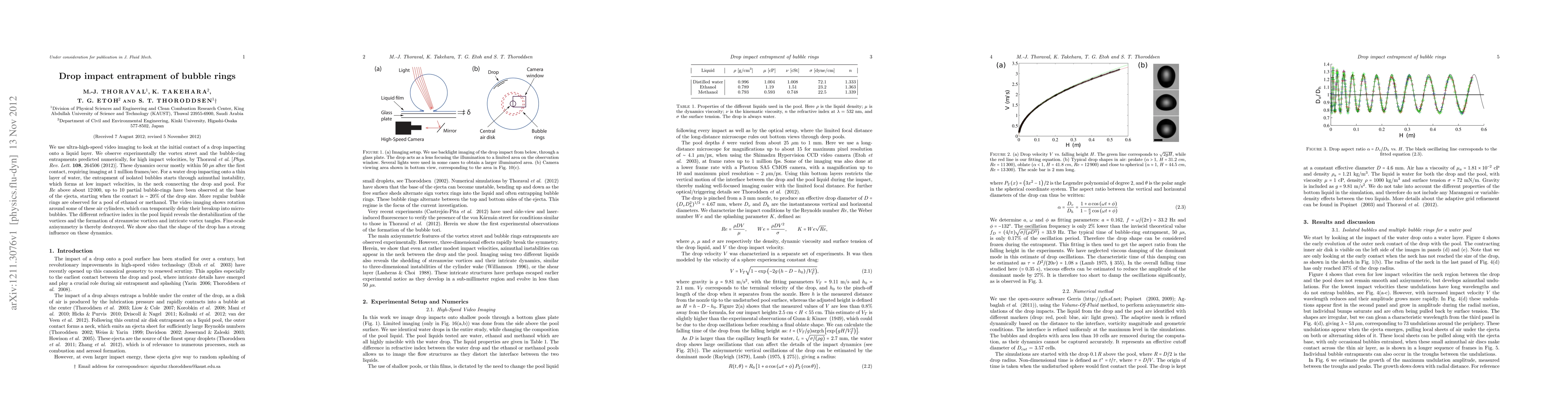 We use ultra-high-speed video imaging to look at the initial contact of a drop impacting onto a liquid layer. We observe experimentally the vortex street and the bubble-ring entrapments predicted numerically, for high impact velocities, by Thoraval et al. [Phys. Rev. Lett. 108, 264506 (2012)]. These dynamics occur mostly within 50 {\mu}s after the first contact, requiring imaging at 1 million frames/sec. For a water drop impacting onto a thin layer of water, the entrapment of isolated bubbles starts through azimuthal instability, which forms at low impact velocities, in the neck connecting the drop and pool. For Re above about 12 000, up to 10 partial bubble-rings have been observed at the base of the ejecta, starting when the contact is about 20% of the drop size. More regular bubble rings are observed for a pool of ethanol or methanol. The video imaging shows rotation around some of these air cylinders, which can temporarily delay their breakup into microbubbles. The different refractive index in the pool liquid reveals the destabilization of the vortices and the formation of streamwise vortices and intricate vortex tangles. Fine-scale axisymmetry is thereby destroyed. We show also that the shape of the drop has a strong influence on these dynamics.