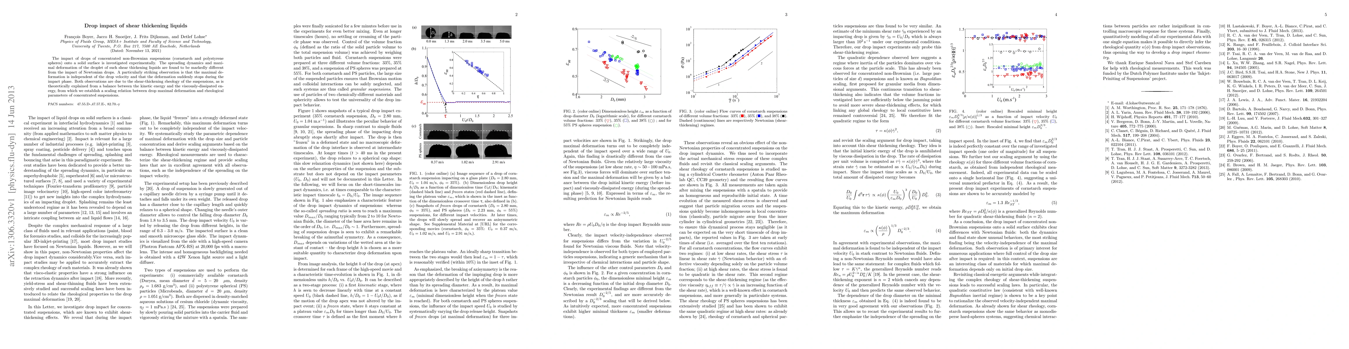 The research methodology involved experimental investigation of drop impacts of shear thickening liquids, specifically concentrated non-Brownian suspensions of cornstarch and polystyrene spheres onto a solid surface. The volume fractions of cornstarch suspensions were 33%, 35%, and 38%, while a 55% suspension of PS spheres was also studied. Control of the volume fraction was achieved by weighing both particles and fluid.
