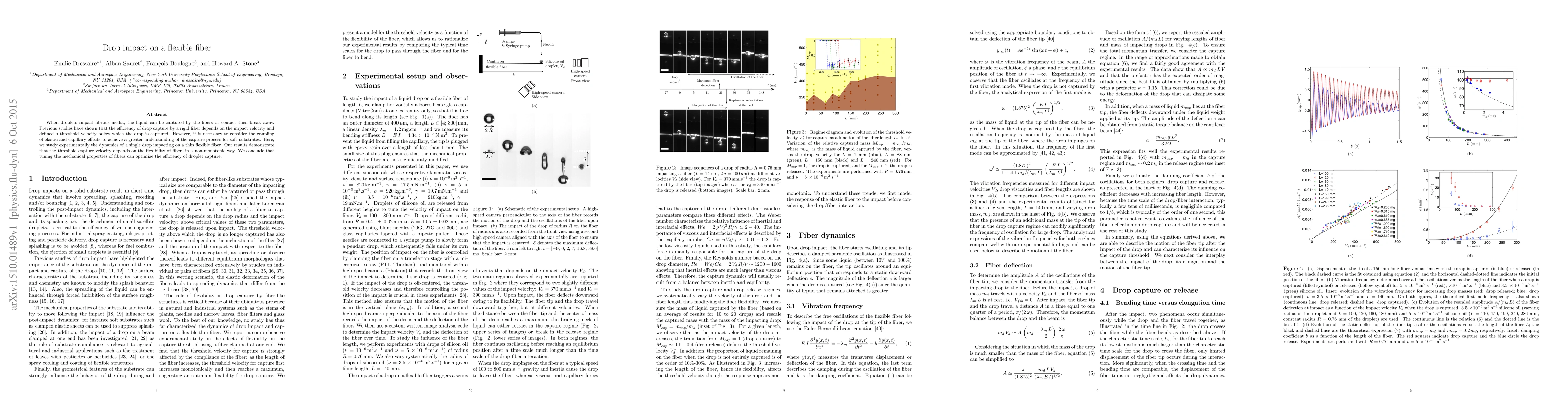 This study experimentally investigates the dynamics of a single drop impacting a thin flexible fiber, revealing that the threshold capture velocity depends non-monotonically on fiber flexibility. The findings suggest that adjusting the mechanical properties of fibers can optimize droplet capture efficiency.
