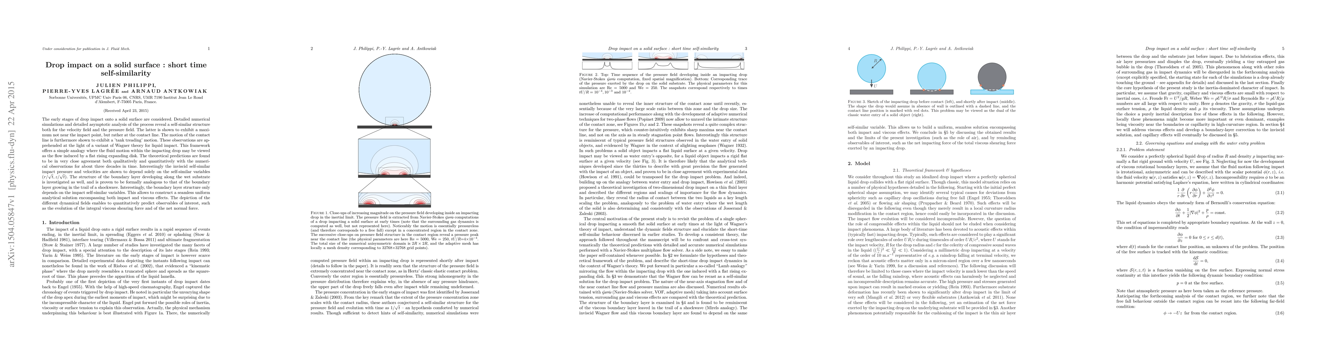 This paper investigates the early stages of drop impact on a solid surface, revealing a self-similar structure in both velocity and pressure fields. The pressure peak occurs at the contact line, and the contact line exhibits a 'tank treading' motion. Theoretical predictions align closely with numerical simulations, showing that inviscid impact dynamics depend on self-similar variables. The study also explores the boundary layer's structure, analogous to shockwave trails, allowing for a uniform analytical solution that predicts viscous forces and net normal force.