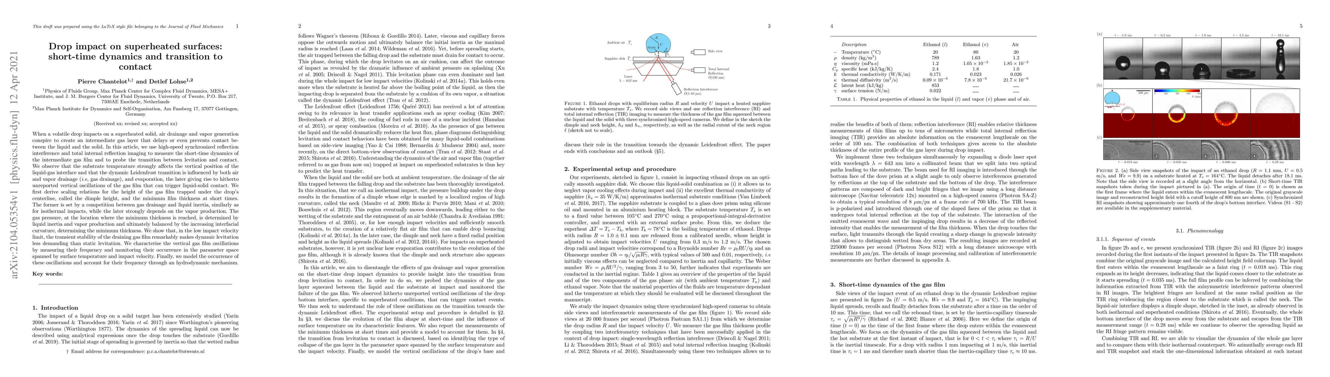 When a volatile drop impacts on a superheated solid, air drainage and vapor generation conspire to create an intermediate gas layer that delays or even prevents contact between the liquid and the solid. In this article, we use high-speed synchronized reflection interference and total internal reflection imaging to measure the short-time dynamics of the intermediate gas film and to probe the transition between levitation and contact. We observe that the substrate temperature strongly affects the vertical position of the liquid-gas interface and that the dynamic Leidenfrost transition is influenced by both air and vapor drainage (\emph{i.e}, gas drainage), and evaporation, the later giving rise to hitherto unreported vertical oscillations of the gas film that can trigger liquid-solid contact. We first derive scaling relations for the height of the gas film trapped under the drop's centerline, called the dimple height, and the minimum film thickness at short times. The former is set by a competition between gas drainage and liquid inertia, similarly as for isothermal impacts, while the later strongly depends on the vapor production. The gas pressure, at the location where the minimum thickness is reached, is determined by liquid inertia and vapor production and ultimately balanced by the increasing interfacial curvature, determining the minimum thickness. We show that, in the low impact velocity limit, the transient stability of the draining gas film remarkably makes dynamic levitation less demanding than static levitation. We characterise the vertical gas film oscillations by measuring their frequency and monitoring their occurrence in the parameter space spanned by surface temperature and impact velocity. Finally, we model the occurrence of these oscillations and account for their frequency through an hydrodynamic mechanism.