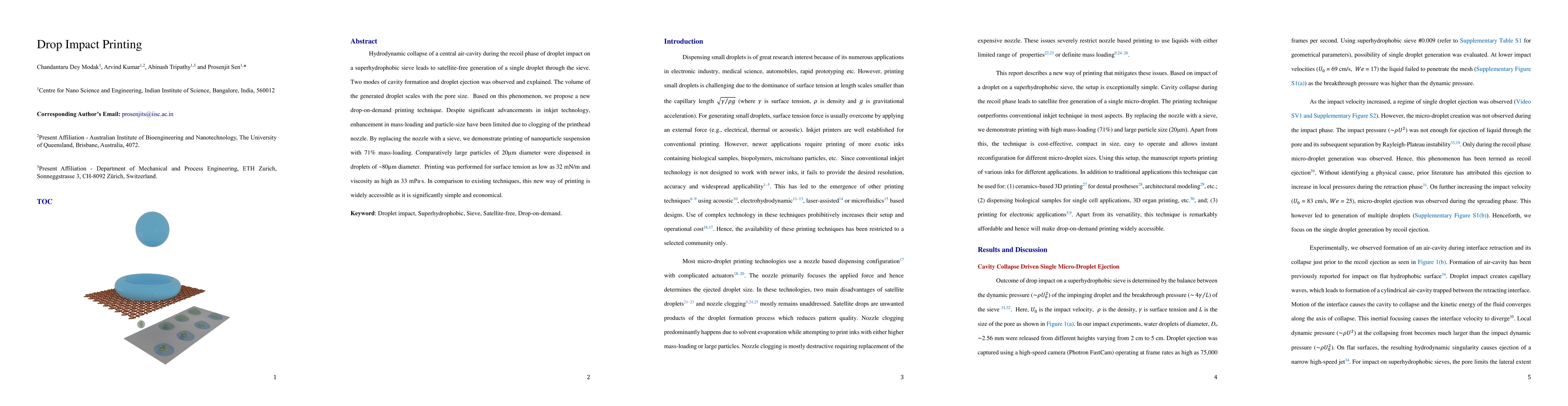 This paper proposes a novel drop-on-demand printing technique using superhydrophobic sieves to generate single droplets without satellites, enabling high mass-loading and large particle printing. The method is simple, economical, and effective for a wide range of fluid properties.