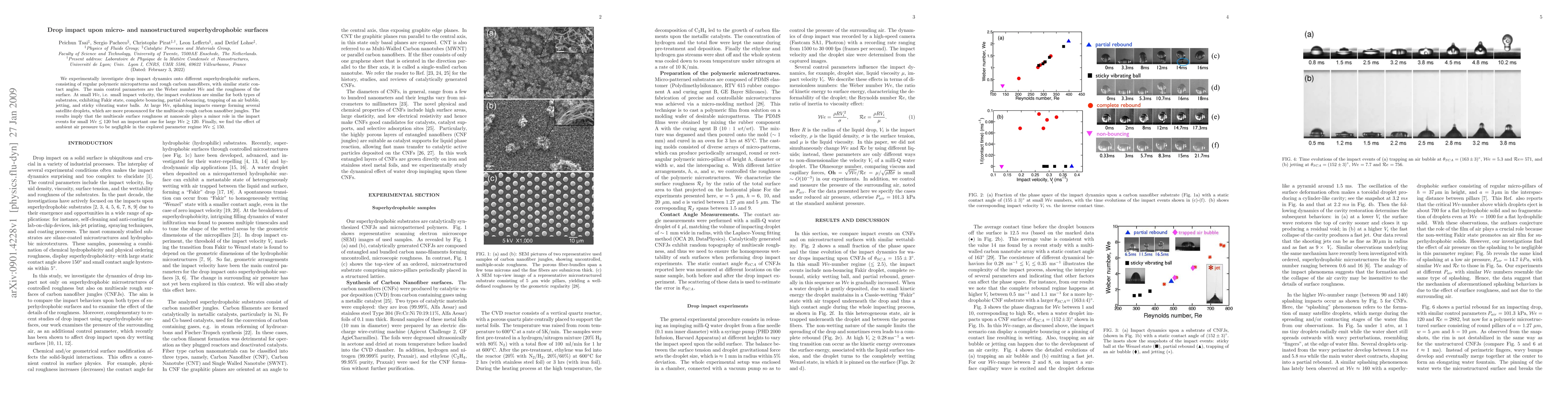 We experimentally investigate drop impact dynamics onto different superhydrophobic surfaces, consisting of regular polymeric micropatterns and rough carbon nanofibers, with similar static contact angles. The main control parameters are the Weber number \We and the roughness of the surface. At small \We, i.e. small impact velocity, the impact evolutions are similar for both types of substrates, exhibiting Fakir state, complete bouncing, partial rebouncing, trapping of an air bubble, jetting, and sticky vibrating water balls. At large \We, splashing impacts emerge forming several satellite droplets, which are more pronounced for the multiscale rough carbon nanofiber jungles. The results imply that the multiscale surface roughness at nanoscale plays a minor role in the impact events for small \We $\apprle 120$ but an important one for large \We $\apprge 120$. Finally, we find the effect of ambient air pressure to be negligible in the explored parameter regime \We $\apprle 150$
