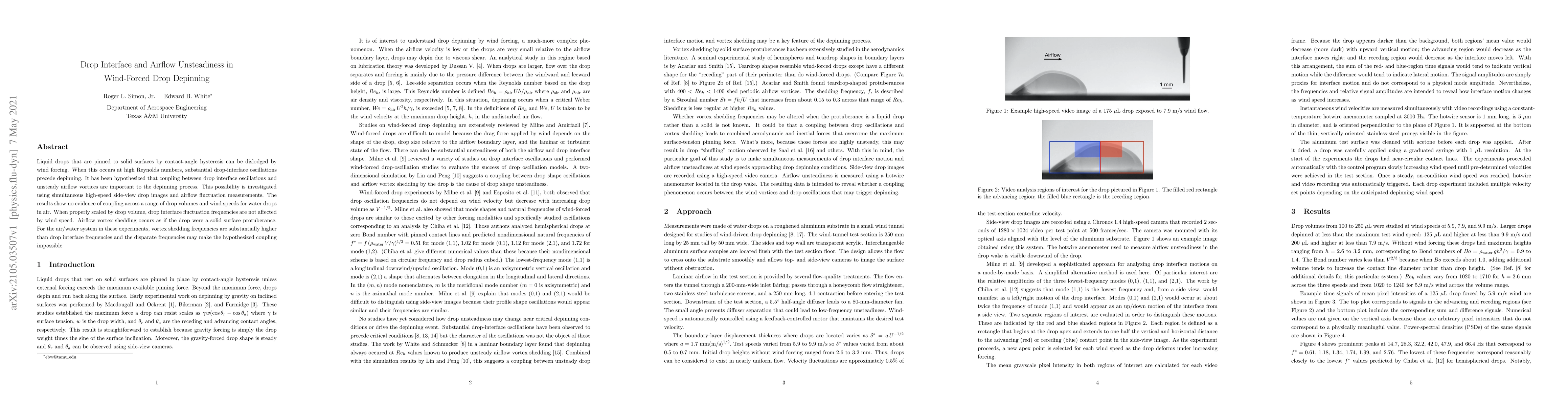 This study investigates the depinning of wind-forced liquid drops, finding no evidence of coupling between drop interface oscillations and unsteady airflow vortices. Vortex shedding frequencies are much higher than drop interface frequencies, suggesting the hypothesized coupling is unlikely.