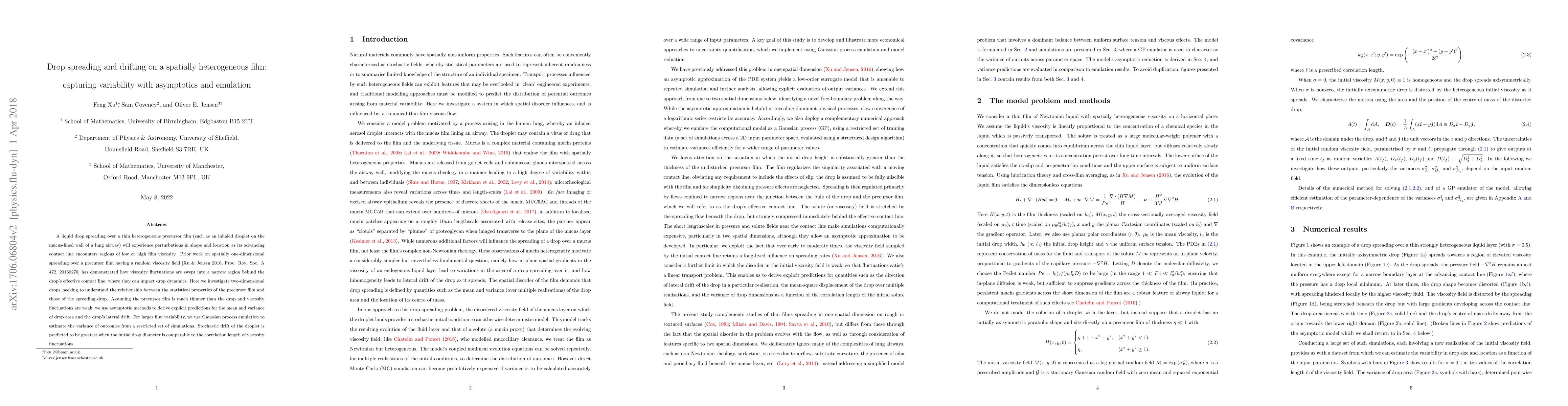 A liquid drop spreading over a thin heterogeneous precursor film (such as an inhaled droplet on the mucus-lined wall of a lung airway) will experience perturbations in shape and location as its advancing contact line encounters regions of low or high film viscosity. Prior work on spatially one-dimensional spreading over a precursor film having a random viscosity field [Xu & Jensen 2016, Proc. Roy. Soc. A 472, 20160270] has demonstrated how viscosity fluctuations are swept into a narrow region behind the contact line, where they can impact drop dynamics. Here we investigate two-dimensional drops, seeking to understand the relationship between the statistical properties of the precursor film and those of the spreading drop. Assuming the precursor film is much thinner than the drop and viscosity fluctuations are weak, we use asymptotic methods to derive explicit predictions for the mean and variance of drop area and the drop's lateral drift. For larger film variability, we use Gaussian process emulation to estimate the variance of outcomes from a restricted set of simulations. Stochastic drift of the droplet is predicted to be greatest when the initial drop diameter is comparable to the correlation length of viscosity fluctuations.