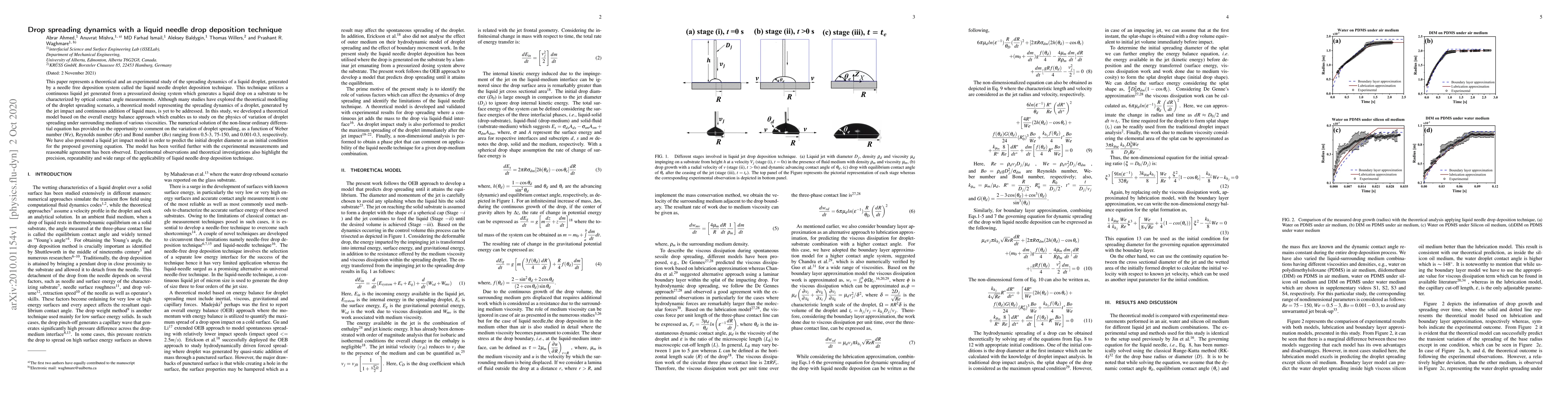 This paper presents a theoretical and experimental study on the spreading dynamics of droplets using a liquid needle drop deposition technique, developing a model based on energy balance to analyze droplet behavior under varying viscosities. The model, verified with experimental data, highlights the technique's precision and wide applicability.