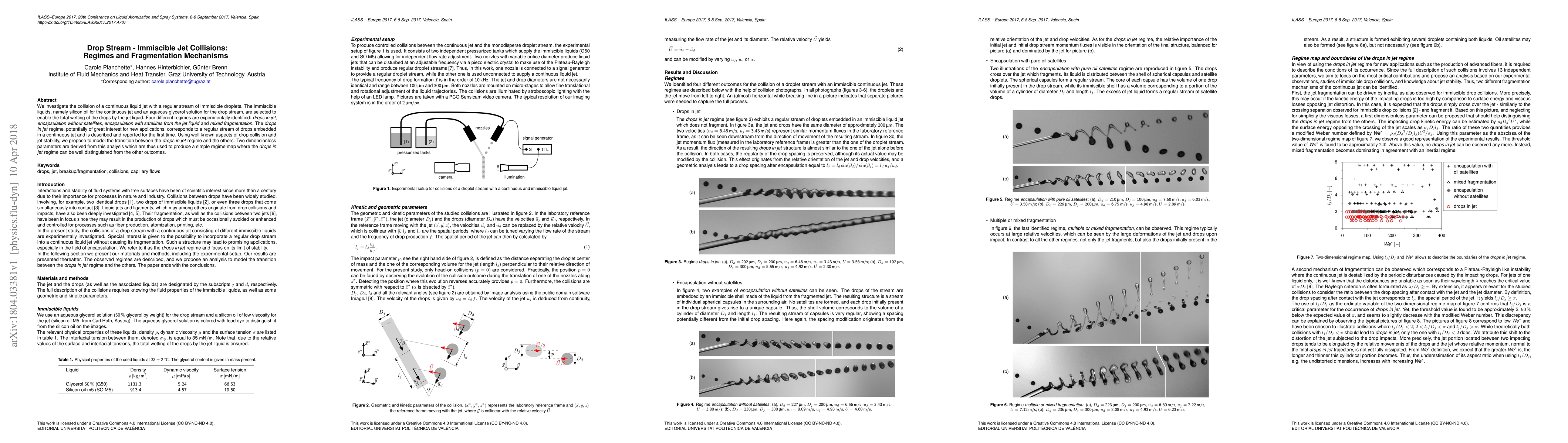 This paper explores the collision dynamics between a continuous liquid jet and a stream of immiscible droplets, identifying four distinct regimes: drops in jet, encapsulation without satellites, encapsulation with satellites, and mixed fragmentation. A novel regime, drops in jet, is described for the first time, offering potential for new applications.