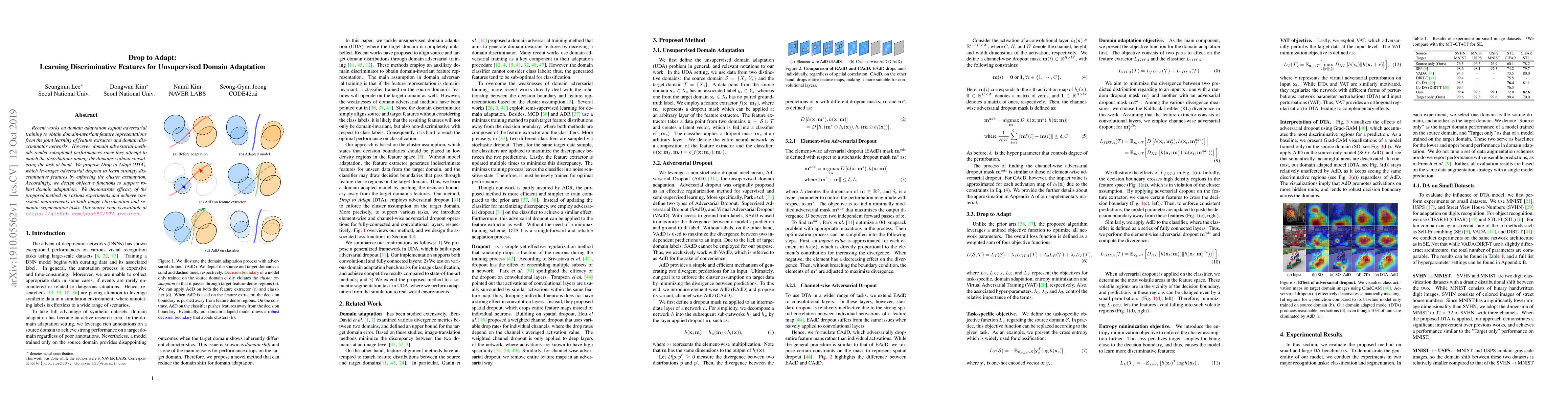 The Drop to Adapt (DTA) method leverages adversarial dropout to learn discriminative features for unsupervised domain adaptation, enforcing the cluster assumption for better performance. Experiments show consistent improvements in image classification and semantic segmentation tasks.