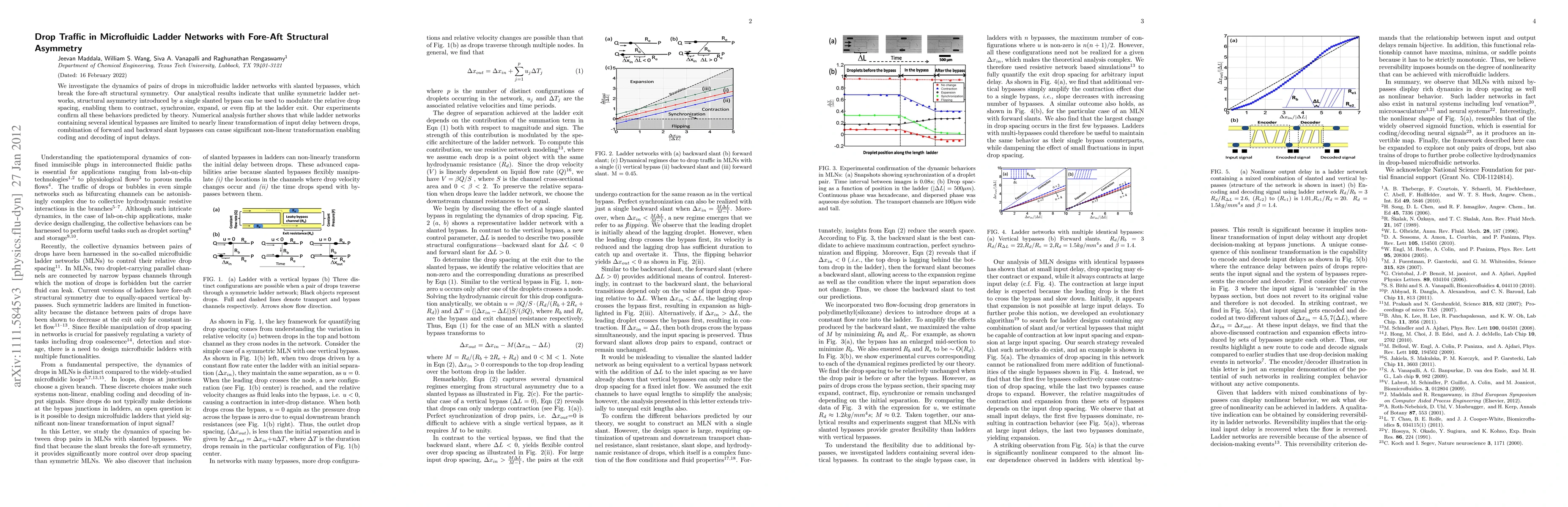 This paper explores how structural asymmetry in microfluidic ladder networks with slanted bypasses can modulate drop dynamics, allowing for contraction, synchronization, expansion, or inversion of drop spacing. Experimental results validate theoretical predictions, and numerical analysis reveals that mixed combinations of bypasses enable significant non-linear transformation of input delays, facilitating coding and decoding.