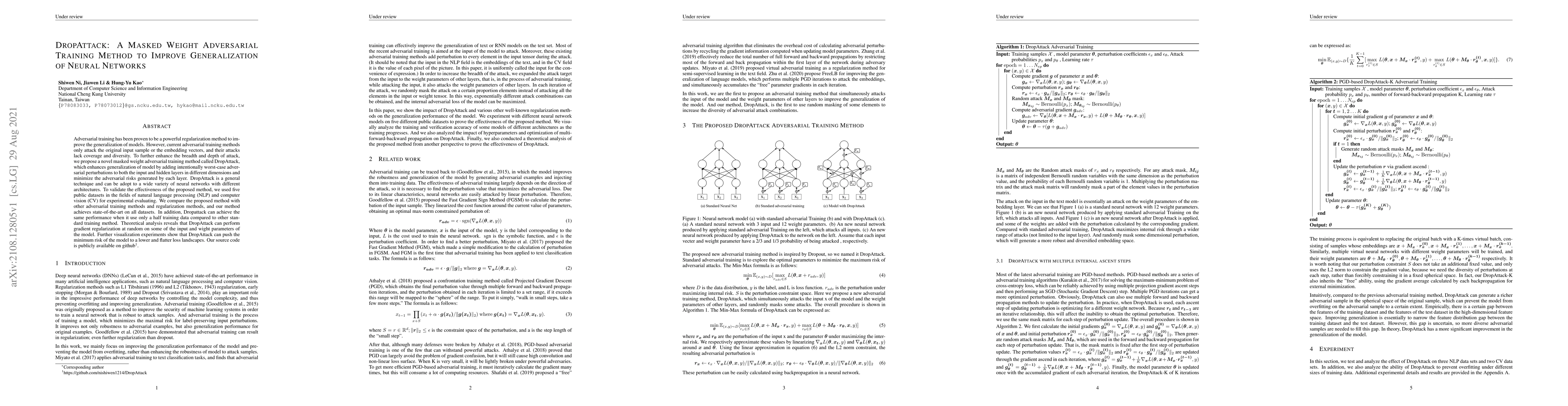 Adversarial training has been proven to be a powerful regularization method to improve the generalization of models. However, current adversarial training methods only attack the original input sample or the embedding vectors, and their attacks lack coverage and diversity. To further enhance the breadth and depth of attack, we propose a novel masked weight adversarial training method called DropAttack, which enhances generalization of model by adding intentionally worst-case adversarial perturbations to both the input and hidden layers in different dimensions and minimize the adversarial risks generated by each layer. DropAttack is a general technique and can be adopt to a wide variety of neural networks with different architectures. To validate the effectiveness of the proposed method, we used five public datasets in the fields of natural language processing (NLP) and computer vision (CV) for experimental evaluating. We compare the proposed method with other adversarial training methods and regularization methods, and our method achieves state-of-the-art on all datasets. In addition, Dropattack can achieve the same performance when it use only a half training data compared to other standard training method. Theoretical analysis reveals that DropAttack can perform gradient regularization at random on some of the input and wight parameters of the model. Further visualization experiments show that DropAttack can push the minimum risk of the model to a lower and flatter loss landscapes. Our source code is publicly available on https://github.com/nishiwen1214/DropAttack.
