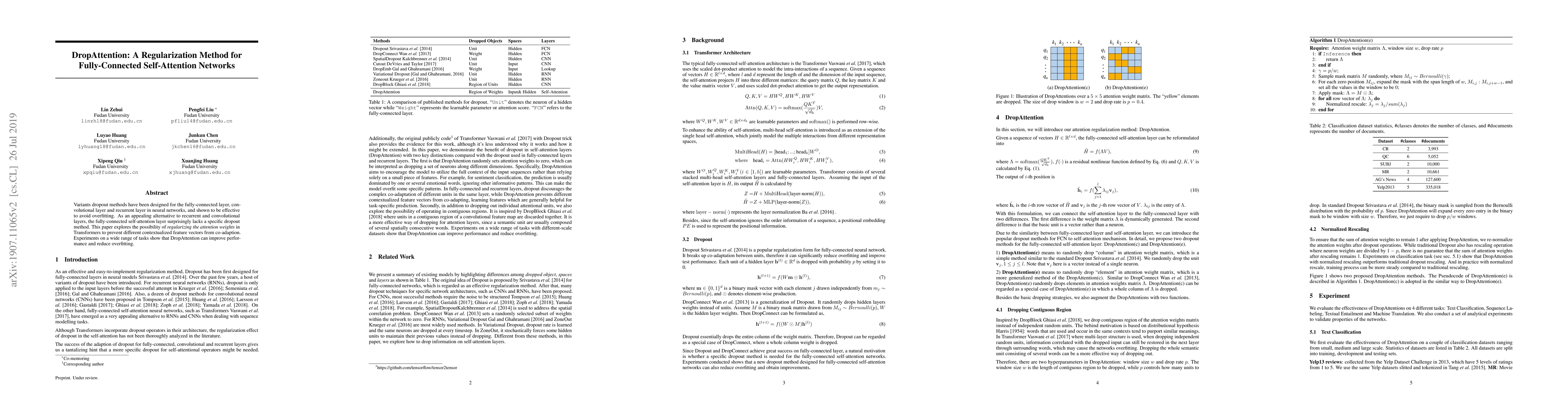 DropAttention, a regularization method for self-attention networks that drops either entire columns or elements in the attention weight matrix, improving generalization and reducing overfitting.