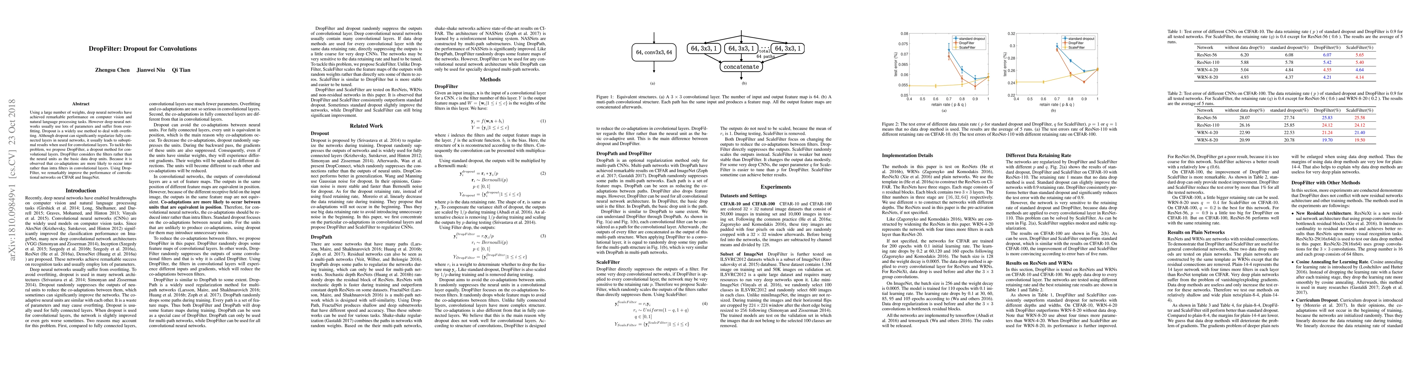 DropFilter improves convolutional network performance by randomly suppressing filter outputs, targeting co-adaptation between intra- and inter-filter connections, leading to better results on CIFAR and ImageNet tasks.