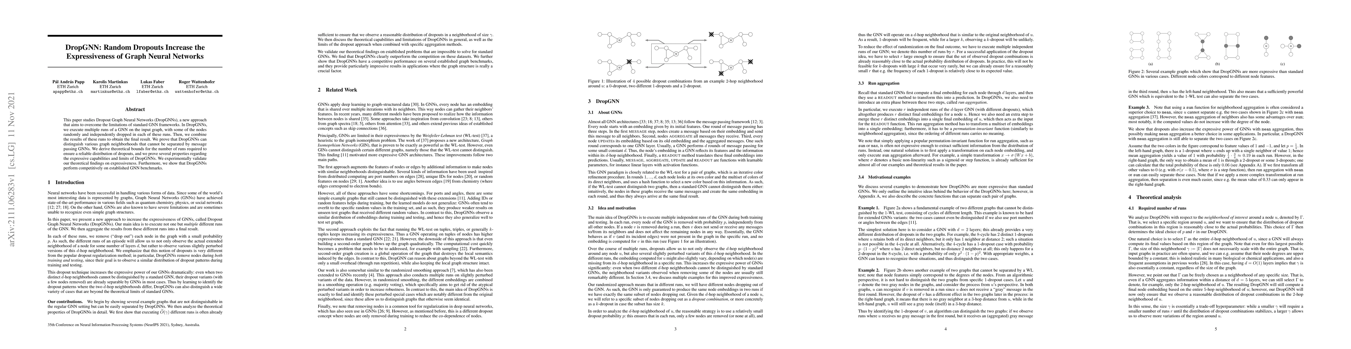 This paper studies Dropout Graph Neural Networks (DropGNNs), a new approach that aims to overcome the limitations of standard GNN frameworks. In DropGNNs, we execute multiple runs of a GNN on the input graph, with some of the nodes randomly and independently dropped in each of these runs. Then, we combine the results of these runs to obtain the final result. We prove that DropGNNs can distinguish various graph neighborhoods that cannot be separated by message passing GNNs. We derive theoretical bounds for the number of runs required to ensure a reliable distribution of dropouts, and we prove several properties regarding the expressive capabilities and limits of DropGNNs. We experimentally validate our theoretical findings on expressiveness. Furthermore, we show that DropGNNs perform competitively on established GNN benchmarks.
