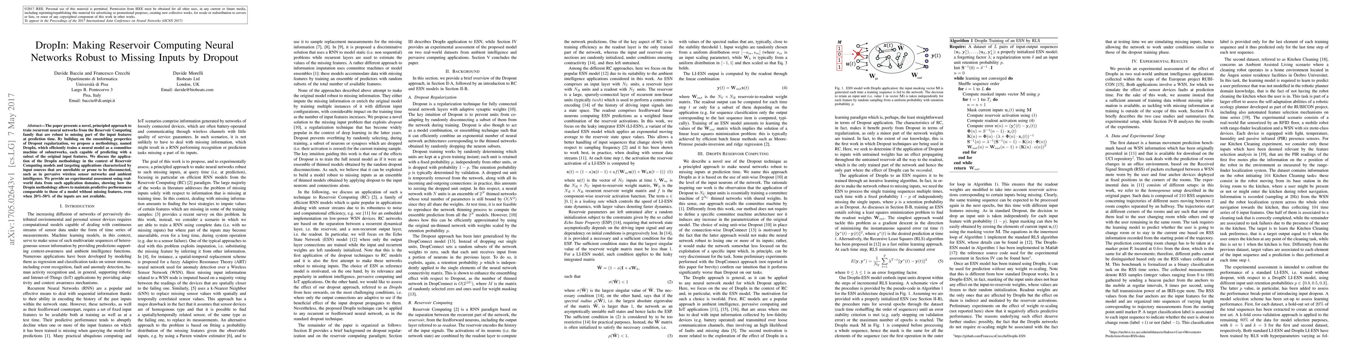 The paper presents a novel, principled approach to train recurrent neural networks from the Reservoir Computing family that are robust to missing part of the input features at prediction time. By building on the ensembling properties of Dropout regularization, we propose a methodology, named DropIn, which efficiently trains a neural model as a committee machine of subnetworks, each capable of predicting with a subset of the original input features. We discuss the application of the DropIn methodology in the context of Reservoir Computing models and targeting applications characterized by input sources that are unreliable or prone to be disconnected, such as in pervasive wireless sensor networks and ambient intelligence. We provide an experimental assessment using real-world data from such application domains, showing how the Dropin methodology allows to maintain predictive performances comparable to those of a model without missing features, even when 20\%-50\% of the inputs are not available.