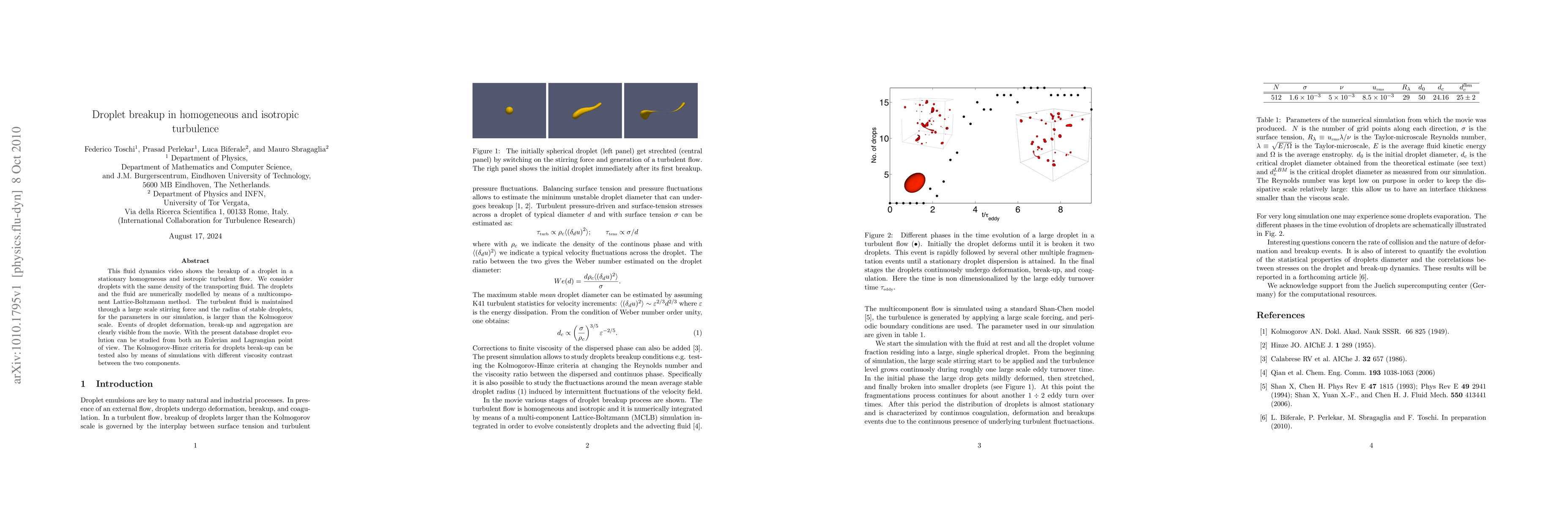 This study numerically models droplet breakup in homogeneous and isotropic turbulence using a multicomponent Lattice-Boltzmann method, revealing droplet deformation, break-up, and aggregation events. The simulations allow for analysis of droplet evolution from both Eulerian and Lagrangian perspectives, testing the Kolmogorov-Hinze criteria for breakup under varying viscosity contrasts.