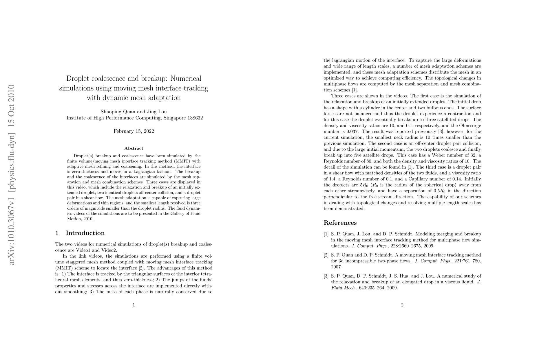 The finite volume/moving mesh interface tracking method (MMIT) with adaptive mesh refining and coarsening was used to simulate droplet breakup and coalescence.