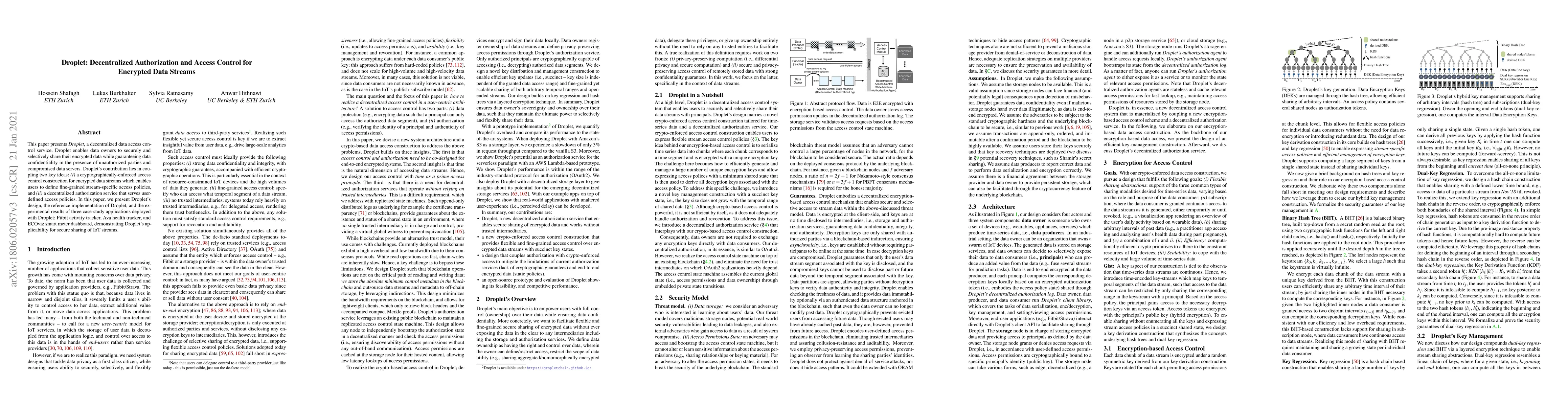 Droplet is a decentralized service for secure, fine-grained access control of encrypted data streams, enabling data owners to define stream-specific access policies while ensuring confidentiality. Experimental results from IoT applications show its effectiveness in secure sharing.