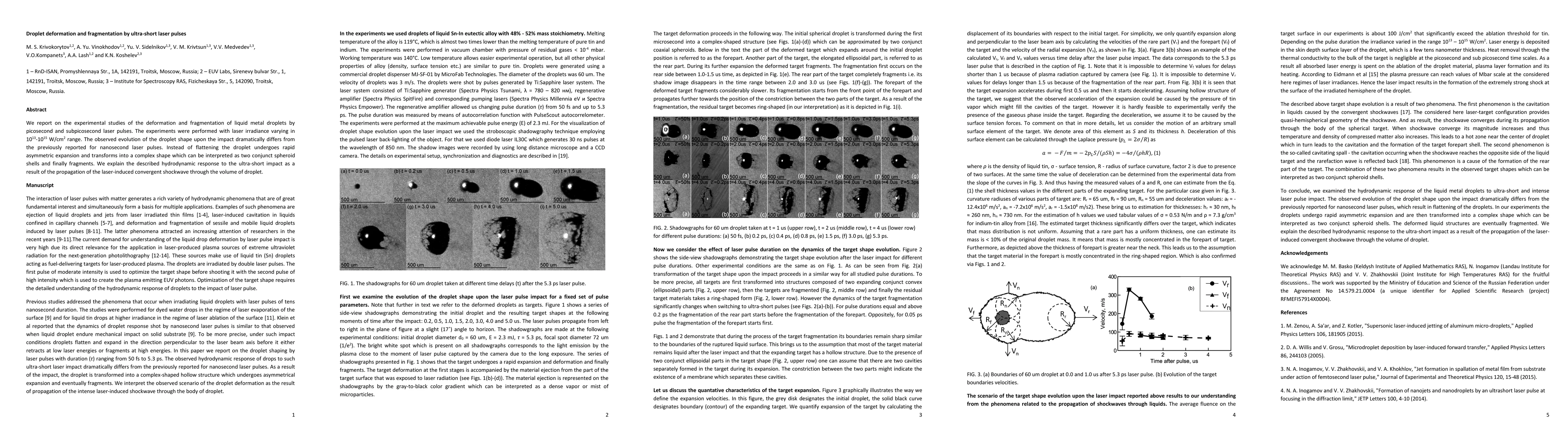 The paper presents a detailed experimental analysis of liquid metal droplet deformation and fragmentation under ultra-short laser pulses, supported by a theoretical explanation based on shockwave propagation.