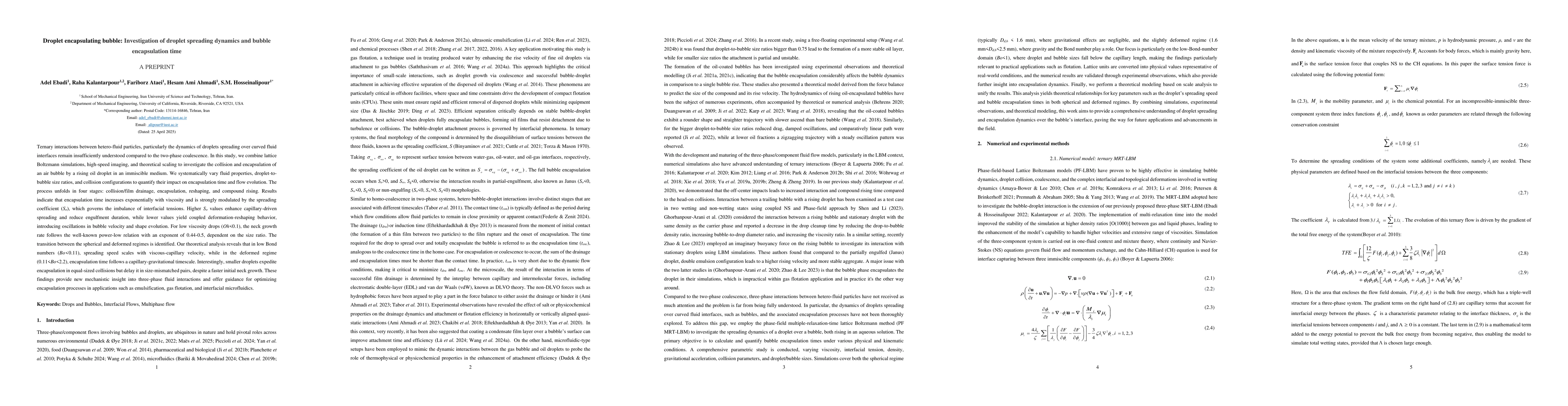 The study combines lattice Boltzmann simulations, high-speed imaging, and theoretical scaling to investigate the collision and encapsulation of an air bubble by a rising oil droplet in an immiscible medium, varying fluid properties, droplet-to-bubble size ratios, and collision configurations.