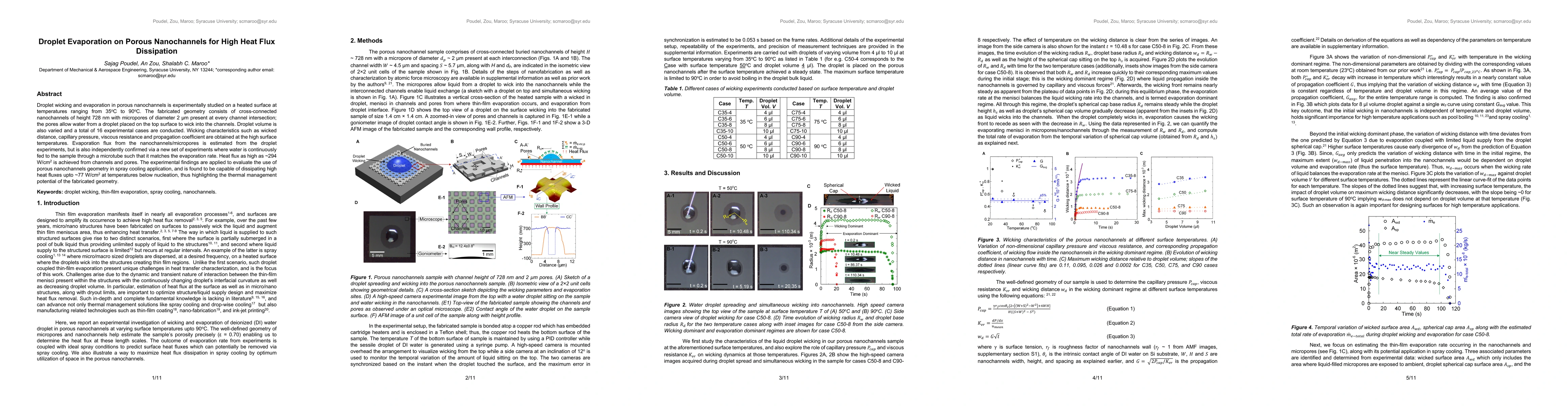 This study investigates droplet evaporation and wicking in porous nanochannels at high temperatures, achieving heat fluxes up to ~294 W/cm², demonstrating the geometry's potential for high heat dissipation in spray cooling applications, capable of managing up to ~77 W/cm².