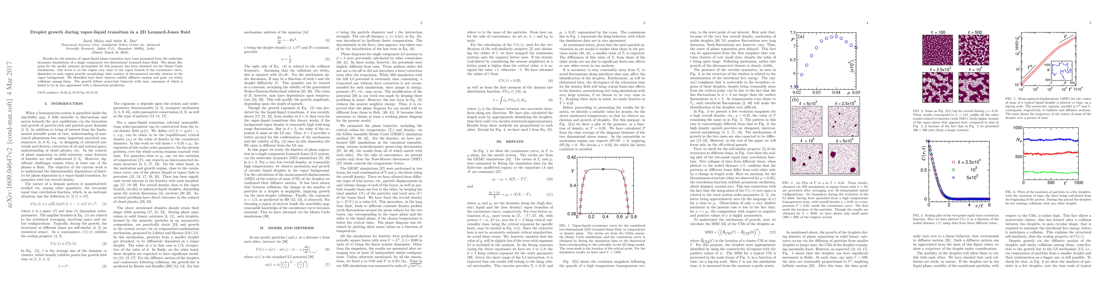 This paper investigates the kinetics of vapor-liquid phase transition in a 2D Lennard-Jones fluid using molecular dynamics simulations, revealing that liquid clusters grow via sticky collisions and exhibit power-law growth, matching theoretical predictions. The study focuses on the region near the vapor branch of the coexistence curve.