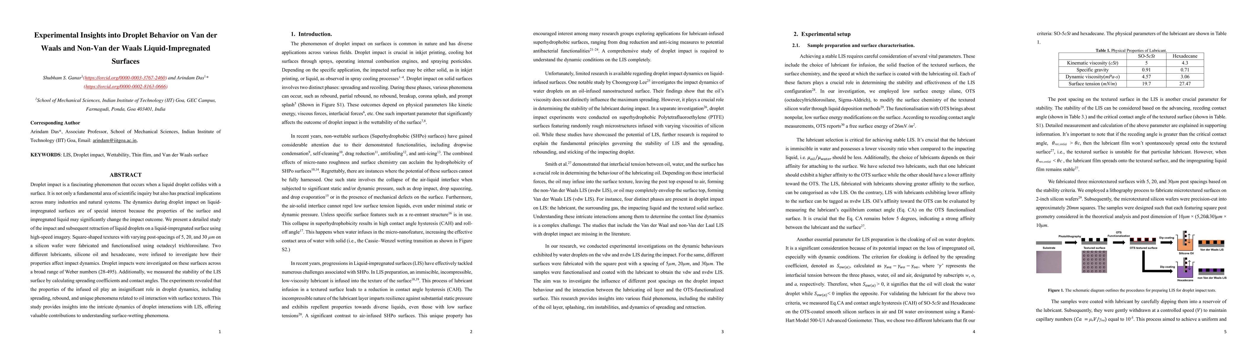 Detailed experimental analysis of droplet impact dynamics on liquid-infused surfaces with varied post-spacings and functionalized with OTS, providing a comprehensive understanding of droplet behavior on van der Waals and non-van der Waals LIS.