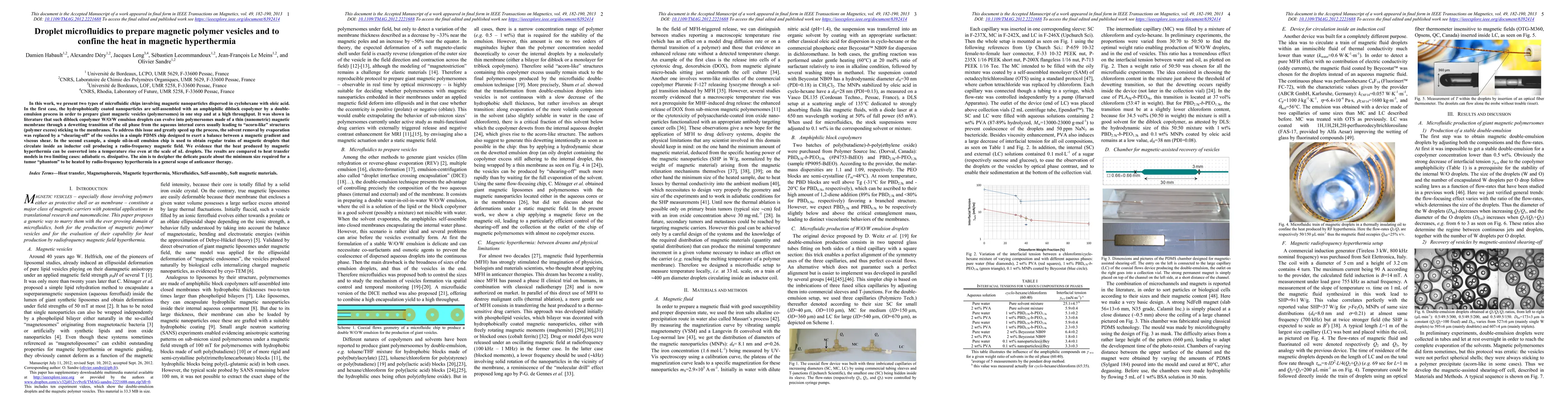 In this work, we present two types of microfluidic chips involving magnetic nanoparticles dispersed in cyclohexane with oleic acid. In the first case, the hydrophobically coated nanoparticles are self-assembled with an amphiphilic diblock copolymer by a double-emulsion process in order to prepare giant magnetic vesicles (polymersomes) in one step and at a high throughput. It was shown in literature that such diblock copolymer W/O/W emulsion droplets can evolve into polymersomes made of a thin (nanometric) magnetic membrane through a dewetting transition of the oil phase from the aqueous internal cores usually leading to "acorn-like" structures (polymer excess) sticking to the membranes. To address this issue and greatly speed up the process, the solvent removal by evaporation was replaced by a "shearing-off" of the vesicles in a simple PDMS chip designed to exert a balance between a magnetic gradient and viscous shear. In the second example, a simple oil-in-oil emulsion chip is used to obtain regular trains of magnetic droplets that circulate inside an inductor coil producing a radio-frequency magnetic field. We evidence that the heat produced by magnetic hyperthermia can be converted into a temperature rise even at the scale of nL droplets. The results are compared to heat transfer models in two limiting cases: adiabatic vs. dissipative. The aim is to decipher the delicate puzzle about the minimum size required for a tumor "phantom" to be heated by radio-frequency hyperthermia in a general scope of anticancer therapy.