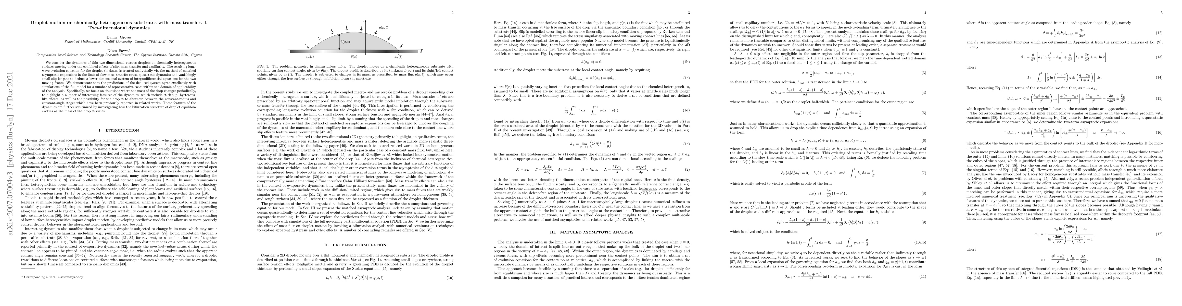 This paper analytically investigates the dynamics of two-dimensional viscous droplets on chemically heterogeneous surfaces, focusing on the effects of slip, mass transfer, and capillarity. The study deduces a simplified system of integrodifferential equations that accurately predicts droplet behavior, including phenomena like stick-slip and hysteresis, under varying mass conditions.